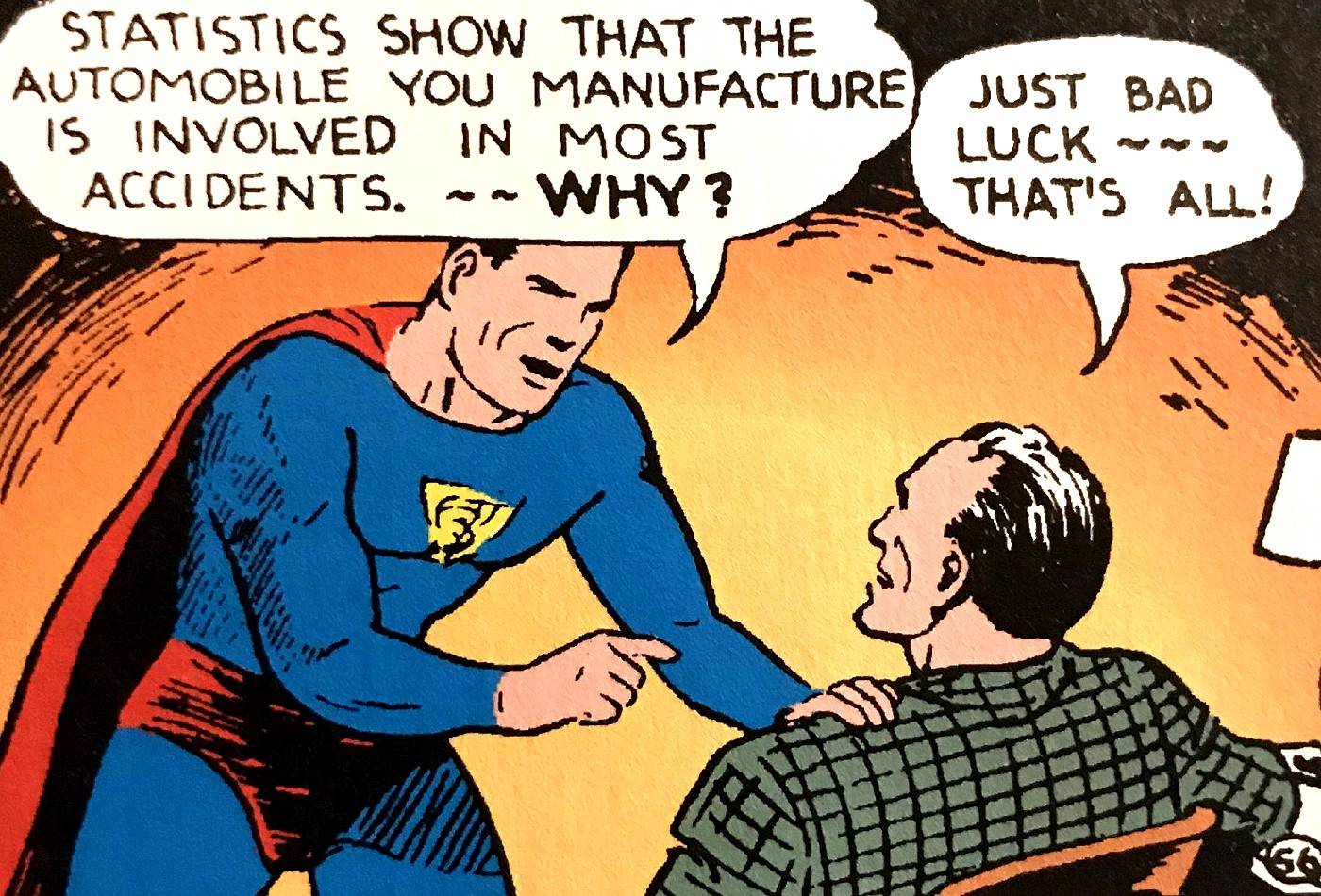 «Era un inmigrante, como la mayoría de ellos, pero no estaba obligado a vestirse con los monótonos colores marrones y grises de la mayoría de la gente en las colas de los años treinta. Vestía con brillantes colores primarios y podía saltar por encima de las calles que ellos tenían que recorrer a duras penas en busca de trabajo. El primer Superman golpeó a los rompehuelgas y arrojó por el horizonte a un casero de los barrios bajos. Obviamente, ese Superman no duró mucho. Muy pronto fue arrebatado a sus creadores y convertido en un personaje mucho más respetable socialmente, de clase media e inclinado hacia la derecha.»