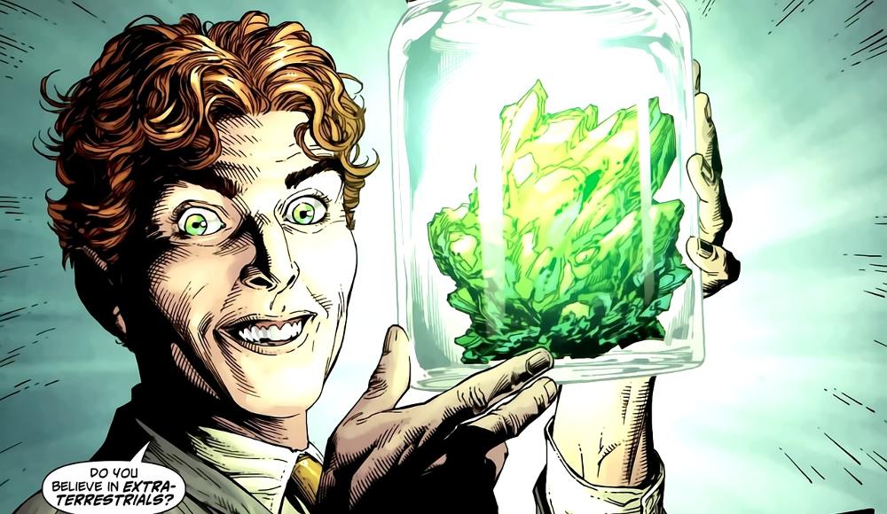 Lex Luthor observa con admiración la kryptonita a través de una especie de incubadora.