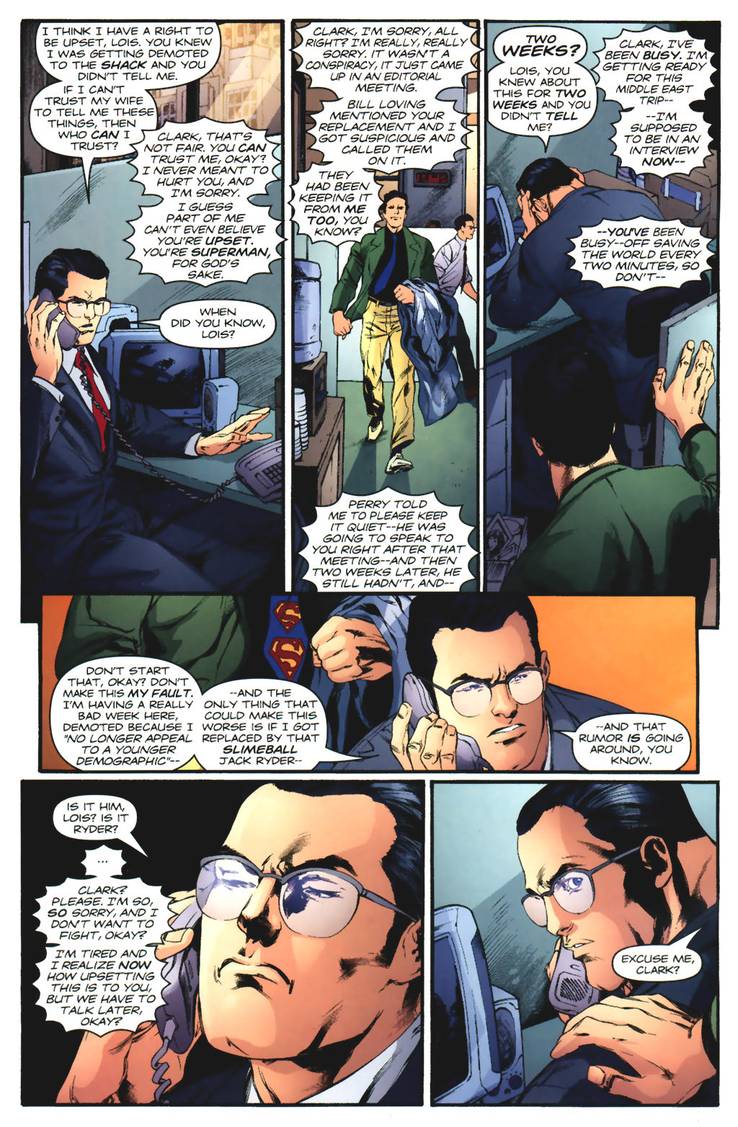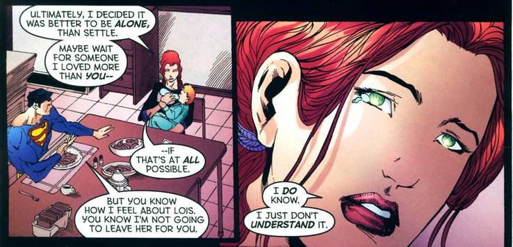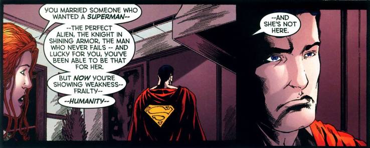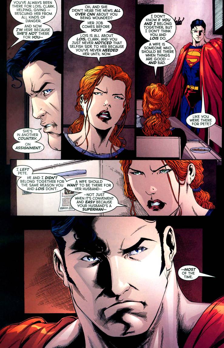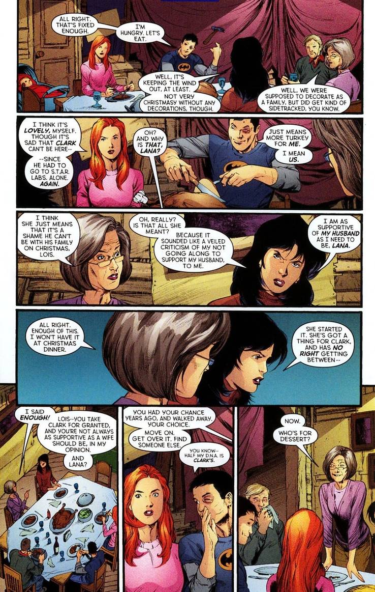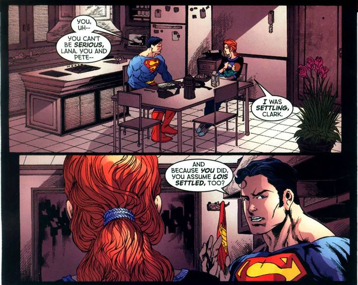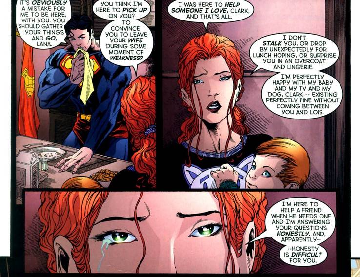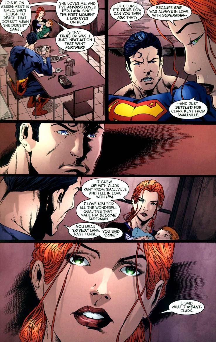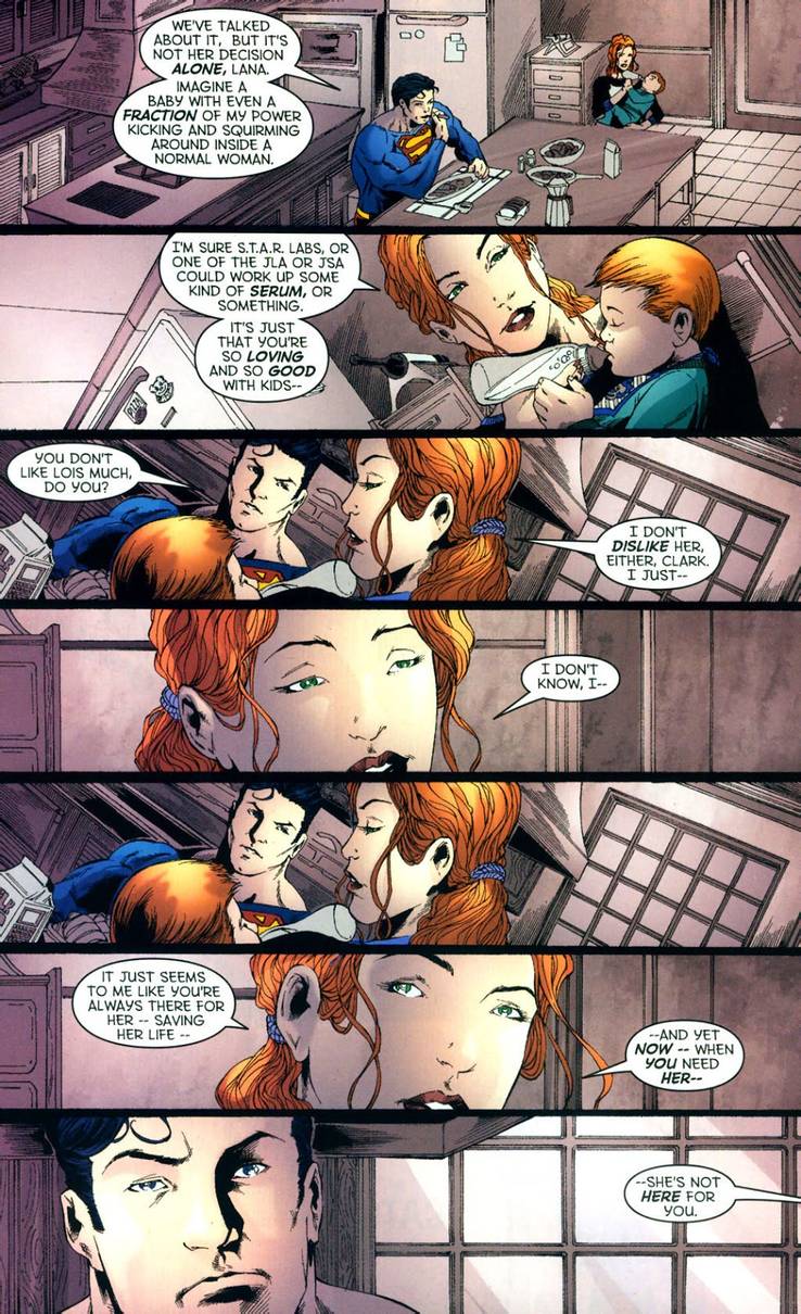 Vale, así que mientras Lois está en el extranjero cubriendo una guerra (que fue, a su vez, cubierta por Aventura de Superman, donde Greg Rucka, sorprendentemente, manejó a Lois Lane mucho mejor), Superman está herido. Alguien tiene que cuidar de él y llega una Lana Lang, ahora divorciada, para hacer el trabajo…