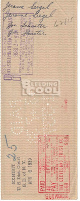 El cheque de Detective Comics, que es del 1 de marzo de 1938, está firmado por Jack Liebowitz y como benefactores Siegel y Shuster con su nombre mal escrito como «Jerome Siegel y Joe Schuster».
