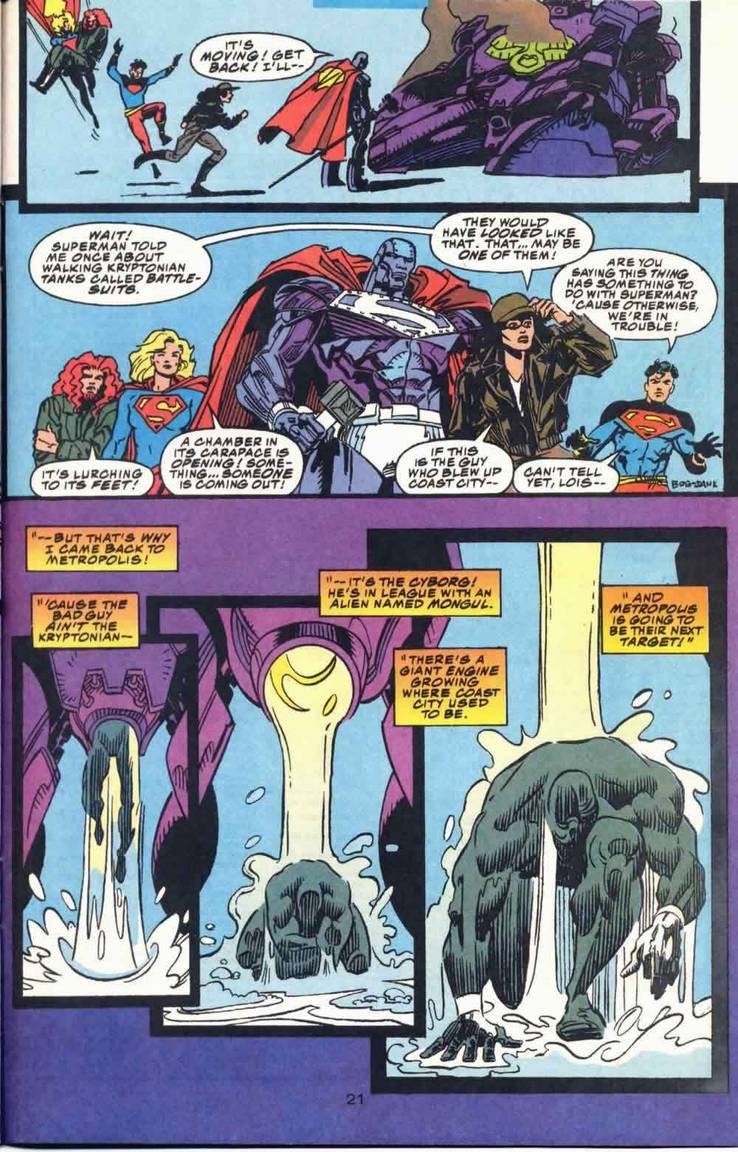 Con el tiempo, se reveló que el Cyborg Superman era en realidad un villano. Los otros tres Superhombres se enfrentaron a él, pero las cosas se veían muy mal para ellos. Sin embargo, las circunstancias comenzaron a cambiar cuando lo que parecía ser un robot kryptoniano escapó de la Fortaleza de la Soledad y viajó a Metrópolis, donde los héroes discutían sobre cómo prepararse para proteger la ciudad de la invasión entrante del Superman Cyborg. La mención de Metrópolis en peligro obligó al habitante de la armadura andante a revelarse: ¡¡Era Superman!!