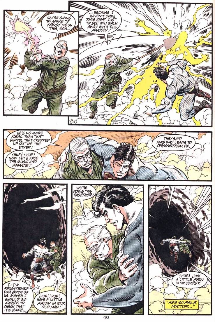 Después de que Superman muriera luchando contra el horrendo monstruo conocido como Doomsday, los títulos de Superman de DC Comics rápidamente comenzaron a abordar cómo el mundo reaccionó a su muerte con «Funeral por un Amigo». Fue una serie de números deprimentes, más aún porque terminó con el padre adoptivo de Superman, Jonathan Kent, colapsando de un ataque al corazón, justo antes de que los cómics se tomaran un paréntesis de tres meses, dejando el destino de Pa Kent en el misterio. La historia se retomó en Aventuras de Superman #500 (el último número escrito por Jerry Ordway, quien fue el único creador que quedó del reinicio de El Hombre de Acero en 1986). Pa Kent está en alguna versión de la otra vida, donde se encuentra con su hijo adoptivo y decide que en lugar de volver a su propia vida, arriesgará todo para salvar a su hijo. Jonathan entonces viaja a través de una serie de encuentros con los horrores de su pasado (luchando en la guerra cuando era joven) y los demonios kryptonianos antes de conseguir que Superman acepte luchar para vivir de nuevo. Los dos hombres eligen entonces renunciar a «ir a la luz» y en su lugar intentar volver.