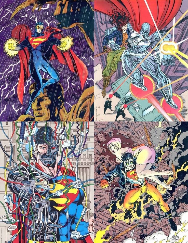 Eso, por supuesto, condujo a la historia conocida como el «Reinado de los Superhombres», en la que tres de los cuatro nuevos personajes llegaron, alegando que eran un Superman que había regresado, de alguna manera (uno de ellos, John Henry Irons, sólo afirmaba que continuaba con el legado de Superman como superhéroe). Uno de ellos afirmaba ser una versión cibernética de Superman, ya que su cuerpo original había sido demasiado dañado por Doomsday. Otro afirmó ser un clon del Superman original. El último afirmó que había sido transformado por la muerte en un vigilante más despiadado.