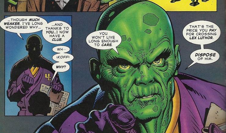 El Super Soldado es el único que puede ver a través de la turbia fachada del villano, lo que lleva a su intensa rivalidad. Este Luthor también se casó con la antigua amante de Super Soldado, Lois Lane. Buscando potenciarse a sí mismo de la misma manera en que Super Soldado fue creado, Luthor experimenta en sí mismo con el mineral alienígena Green K. Esto le da una increíble vida útil, pero también distorsiona fuertemente y muta su apariencia. Como Cráneo Rojo, pasó a dirigir a Hydra