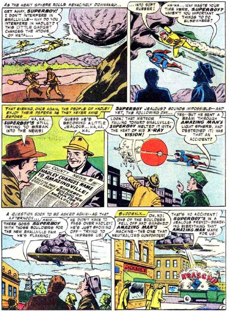 Y así, los ciudadanos de Hadley pronto hicieron lo mismo que los ciudadanos de Metrópolis cada vez que aparece un nuevo superhéroe, se comportan como idiotas con Superboy y creen que Superboy está celoso del nuevo héroe cuando cambian su nombre por el de Amazingville.