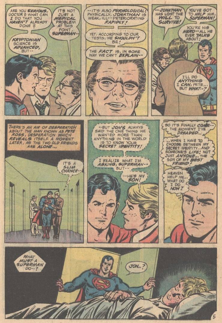 En 1976, el adulto Pete Ross recurre a Superman para que le ayude en Action COmics #457 (de Gerry Conway, Curt Swan y Tex Blaisdell). Su hijo ha perdido toda esperanza de vida y lo único que puede salvarlo es que Superman le revele su identidad secreta al joven Jon. Superman está de acuerdo…