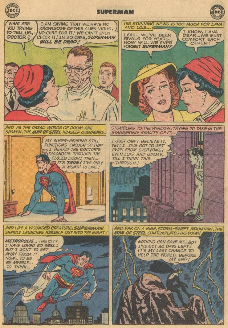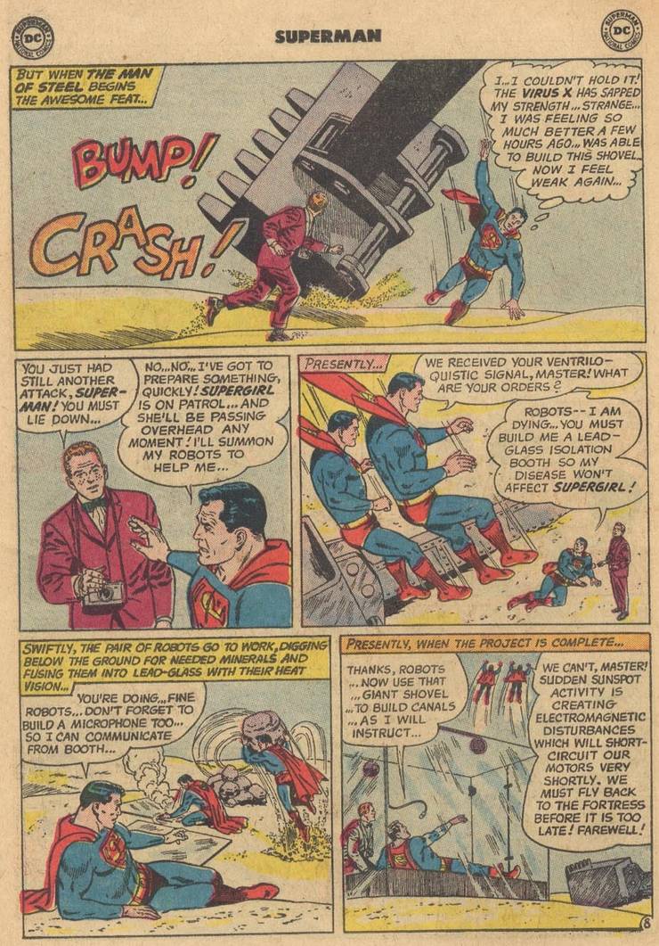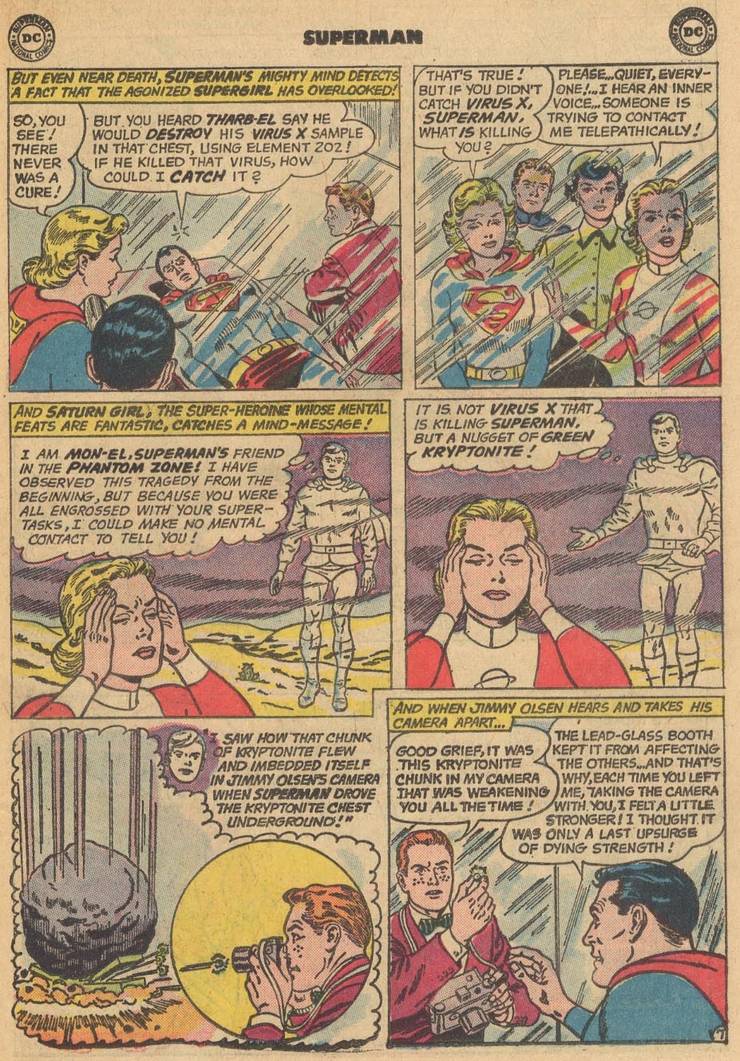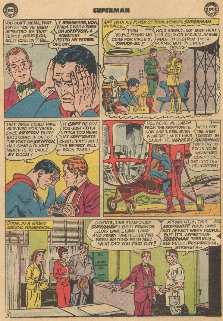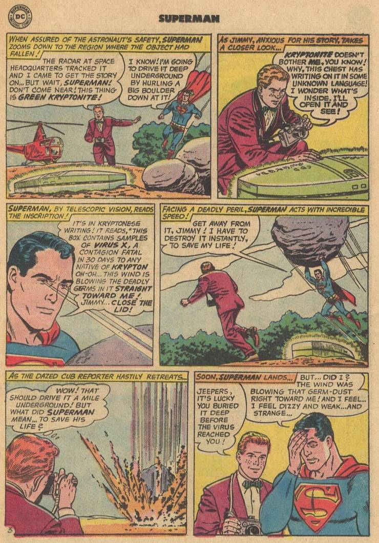 Todo sucedió en el Superman #156 (de Edmond Hamilton, Curt Swan y George Klein), cuando un objeto de Krypton aterrizó en la Tierra (juro que es ridículo la cantidad de cosas de Krypton que acabaron estrellándose en la Tierra más tarde) y Jimmy Olsen lo abrió cuando Superman se dio cuenta de que decía que tenía el virus X dentro…