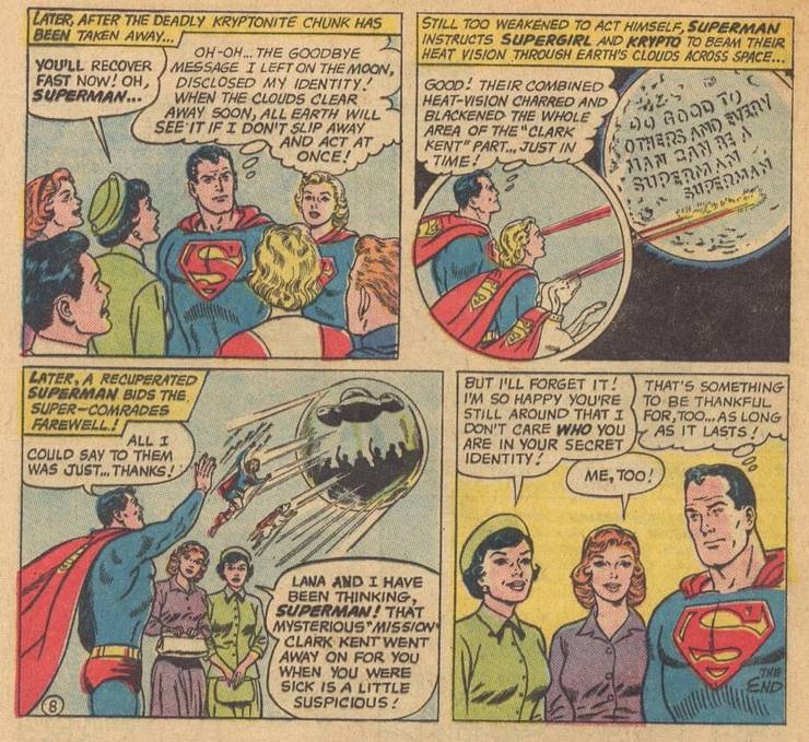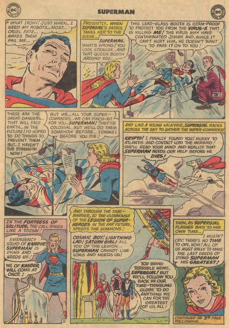 Superman teme por los otros kryptonianos de la Tierra, como Supergirl y los kandorianos de la Ciudad Embotellada de Kandor, así que hace que sus robots le construyan una zona de cuarentena. También mantiene a Jimmy Olsen allí, porque teme que Jimmy, aunque no tenga síntomas, pueda pegarle el virus a Supergirl…