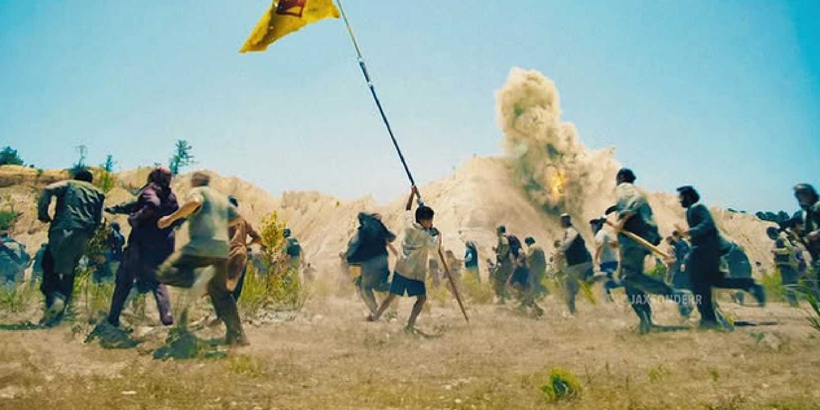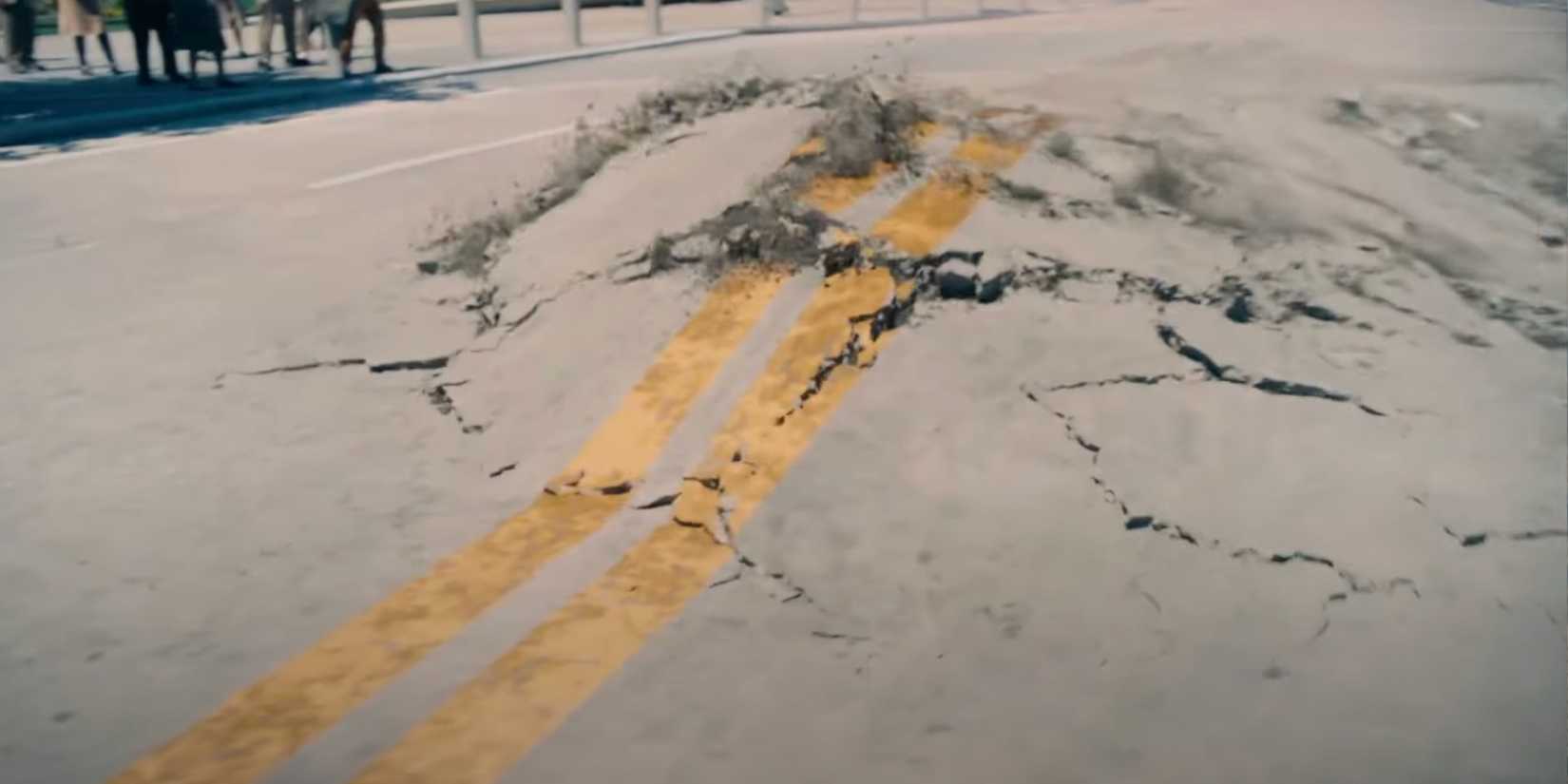 Kal-El aparece haciendo un túnel subterráneo antes de salir de la acera tras ser pisado por un enorme kaiju, reflejando el momento en que Superman perforaba la calle para llegar hasta Lex Luthor en la película original de 1978.
