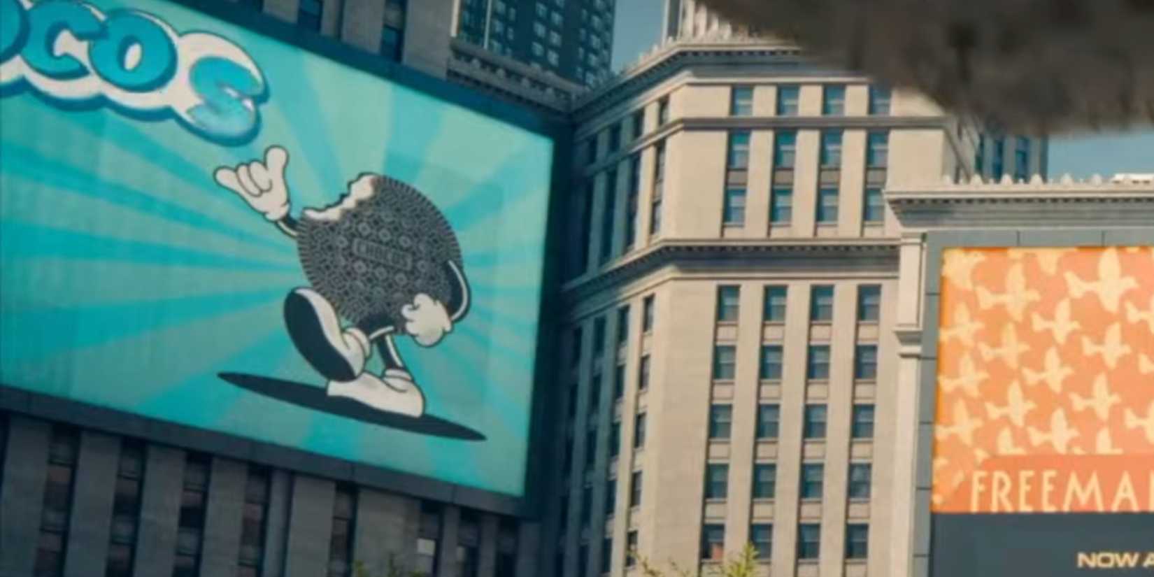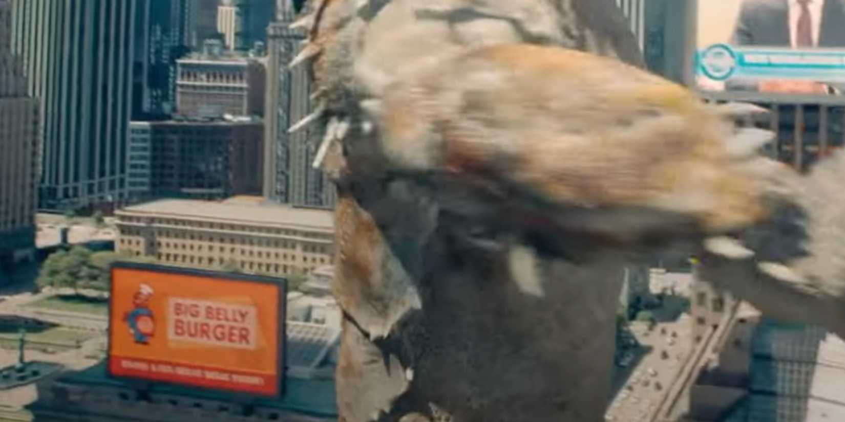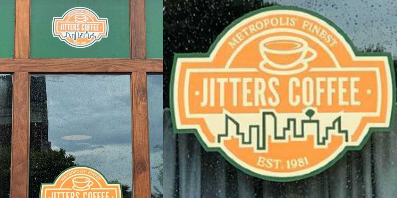 Uno de los muchos letreros y anuncios durante la lucha contra el kaiju en el centro de Metrópolis, Jitters es una conocida cadena de cafés en el Universo DC, más conocida por ser un lugar frecuentado en la serie «Flash» de The CW.