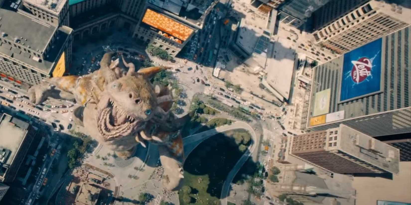 Hawkgirl yendo a por el globo ocular del kaiju definitivamente recuerda a Harley Quinn apuñalando y zambulléndose en el ojo gigante de Starro en El Escuadrón Suicida de James Gunn.