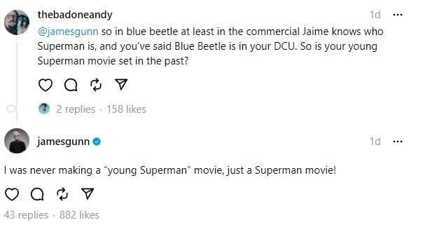 En Threads, @TheBadoneAndy preguntó a Gunn sobre la existencia de Superman establecida en «Blue Beetle», que estará ligada al Universo DC. El usuario se preguntaba si «Superman: Legacy» estará ambientada en el pasado ya que Blue Beetle establece que Jaime Reyes conoce al último hijo de Krypton en esta continuidad. Gunn no tardó en aclarar lo que realmente está haciendo con «Superman: Legacy», confirmando que «nunca hizo una película de «Superman joven», ¡sólo una película de Superman!» Esto viene después de que Gunn había hablado de cómo esta toma en el icono de DC estará en algún lugar en sus 20 años.