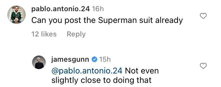 Después de que un fan le preguntara a Gunn si podía «publicar ya el traje de Superman», éste respondió con una decepcionante actualización, diciendo: «Ni siquiera un poco cerca de hacer eso.» Basándonos en las palabras de Gunn, el debate en torno al Clark Kent de Corenswet con o sin calzón durante bastante tiempo.