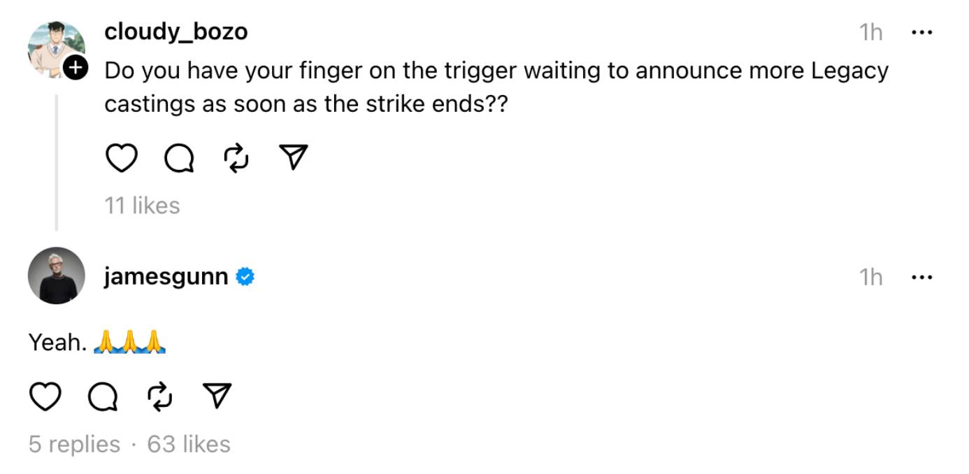 Dado que las negociaciones entre SAG-AFTRA y la Alianza de Productores de Cine y Televisión parecen avanzar sin problemas, los directores se preparan para anunciar sus repartos. En respuesta a un fan en Threads, James Gunn confirmó que la película ha encontrado más miembros en el reparto, y que los revelará una vez concluya la huelga de actores. Vea la interacción a continuación: