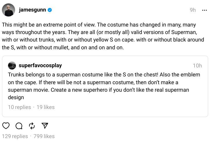 Gunn también respondió a un fan que afirmó: «si no habrá un traje de Superman, entonces no hagas una película de Superman». El co-CEO de DC Studios tachó de «extrema» la opinión del fan, afirmando que el ajuste del superhéroe ha cambiado varias veces a lo largo de varios proyectos de Superman, haciendo hincapié en que el calzón u otros aspectos de su traje no deberían importar. Dijo: