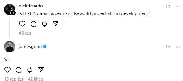 Cuando NickTiznado le preguntó a Gunn si «¿sigue en desarrollo ese proyecto de Abrams Superman Elseworld[s]?», Gunn respondió con un simple «Sí». Hasta el momento, el propio Abrams no ha hablado de la película del Superman negro, ni siquiera después del lanzamiento de DC Studios.