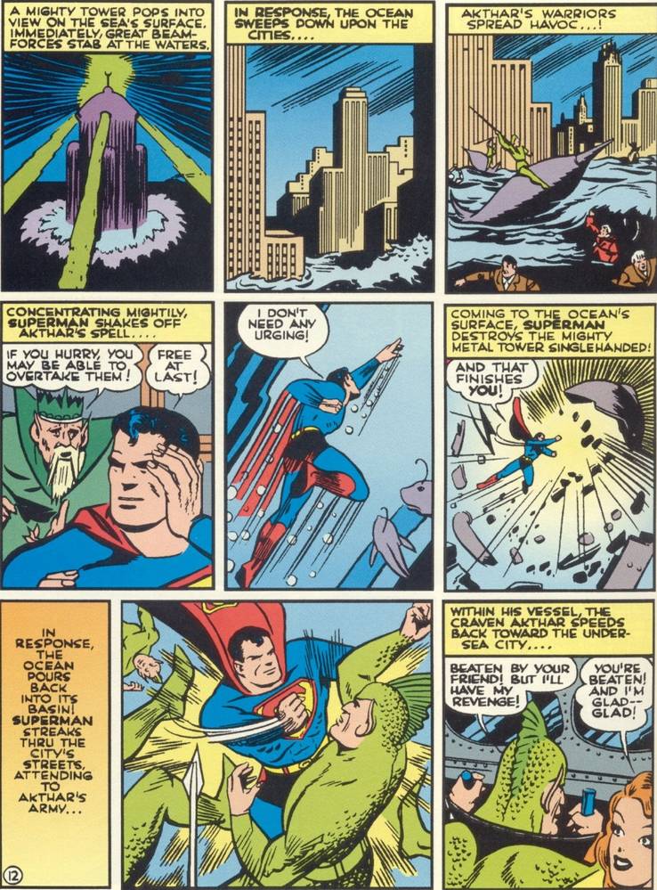 Eso sería en Superman #14, en una historia de Jerry Siegel, Leo Nowak y John Sikela, cuando Superman está encantado con un hechizo de un mago submarino.