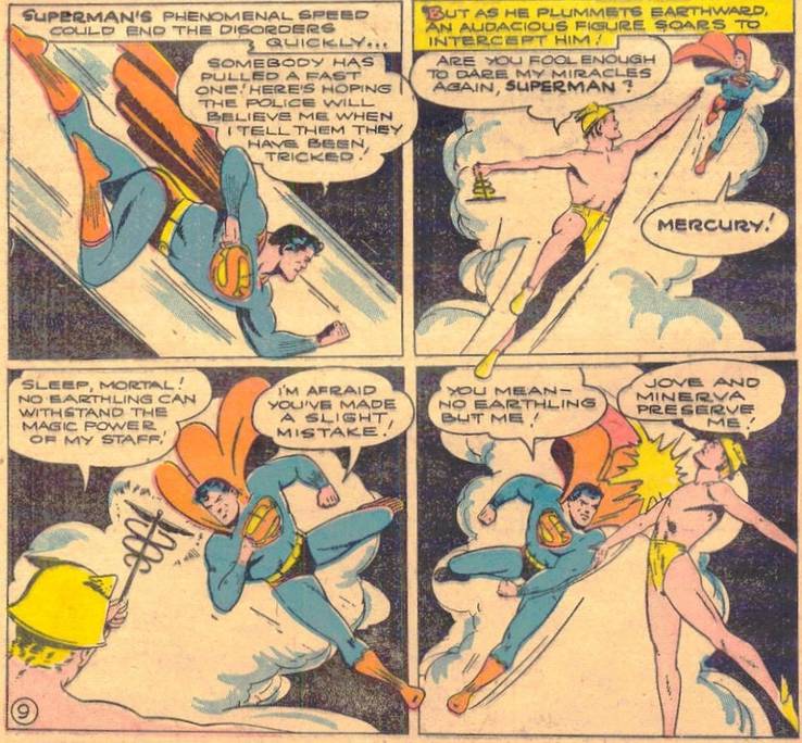 Esta es la Edad de Oro, sin embargo, nadie necesariamente estaba siguiendo la pista de cómo funcionaban los poderes de Superman, así que un año después, en una historia de Don Cameron, Dick Sprang y San Citron, Superman se enfrenta a Mercurio, quien usa su bastón mágico en Superman y se sorprende al saber que Superman es impermeable a sus poderes.