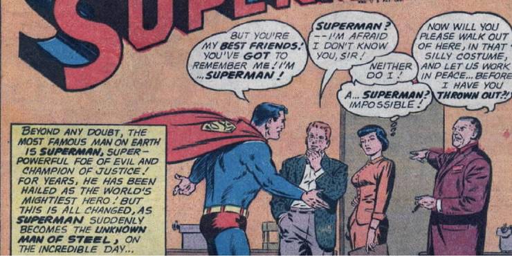 En «Superman» #150 (por un raro placer, tres de los más importantes creadores de la historia de Superman – Jerry Siegel, Curt Swan y Wayne Boring – Boring raramente entintó a Swan, por lo que esto es bastante raro), Superman regresó a la Tierra y encontró que nadie sabía quién era. No sólo eso, sino que todos los registros de sus actos pasados habían sido borrados. Además, cada vez que intentaba demostrar que era súper, resultaba que sólo usaba un jet pack para volar o resortes para saltar en el aire, ¡aunque el jet pack y los resortes no estuvieran allí cuando empezó!