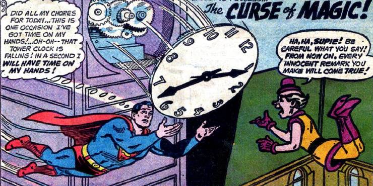 La maldición hizo que todo lo que Superman dijera se hiciera realidad, aunque lo que dijera fuera una tontería. Por ejemplo, mientras estaba en su identidad de Clark Kent, le dijo a Lois Lane que se sentía como si estuviera «caminando en el aire» después de ganar un premio. Entonces empezó a levitar de verdad. Las cosas se volvieron más locas cuando se vio envuelto en un rodaje de una película en el que siguió causando problemas, como leer a la protagonista infantil de la película la canción infantil «Twinkle twinkle little star». ¡Eso hizo que la pequeña actriz infantil se convirtiera en una estrella literal! Afortunadamente, Superman descubrió que la forma de arreglar la maldición era decir su nombre al revés, lo cual hizo.