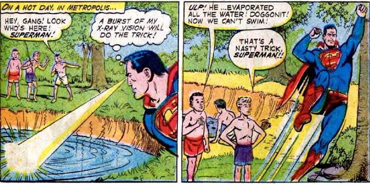 Este es un poco confuso ya que el gancho de la cuestión (tres versiones diferentes de Superman) realmente no era parte de la broma del Sr. Mxyzptlk, sino que era parte de lo que quería a cambio de detener su broma. Veréis, en «Superman» #135 (de Jerry Siegel y Al Plastino), el señor Mxyzptlk usó sus poderes para hipnotizar a Superman para que hiciera lo que quisiera. Y lo que quería era hacer que Superman actuara como un súper imbécil (no te preocupes, Mxy, Superman tiene mucha experiencia en hacer cosas malas).