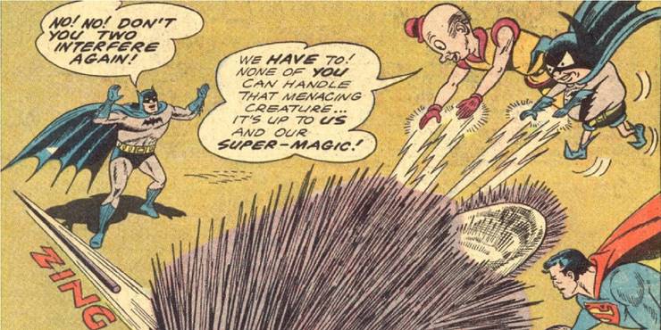 Sin embargo, como se ve en «World’s Finest Comics» #123 (de Edmond Hamilton, Dick Sprang y Sheldon Moldoff), eso no era necesariamente una buena noticia para nuestros héroes, ya que cuando ambas plagas aparecieron al mismo tiempo para molestar a sus respectivos héroes, combinaron sin querer sus poderes para causar una criatura mágica tan poderosa que ninguno de ellos pudo detenerla, tampoco. Batman, sin embargo, afortunadamente descubrió la absurda lógica de su magia y se le ocurrió un plan en el que crearía un duplicado exacto del mismo monstruo. Los monstruos acabaron absorbiéndose unos a otros porque… bueno… um… oye, Batman es muy inteligente y sabía que funcionaría, así que ¿por qué cuestionarlo?