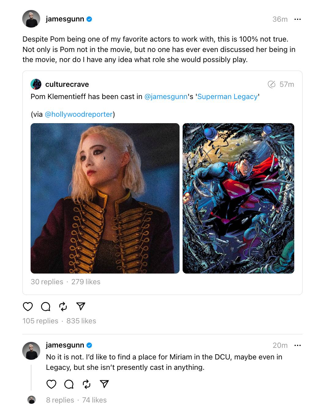 «Me gustaría encontrar un lugar para Miriam en el DCU, tal vez incluso en Legacy, pero actualmente no está en el reparto de nada.» Gunn también reveló que no tiene ni idea de cómo empezaron estos castings, diciendo «Sinceramente, no puedo imaginarme de dónde salió lo de Pom. Me resulta muy extraño. Normalmente los oficios reales no están tan lejos». También confirmó que hay «al mil por cien» un papel para Klementieff en el DCU, pero es «un personaje específico que no tiene nada que ver con Superman Legacy».