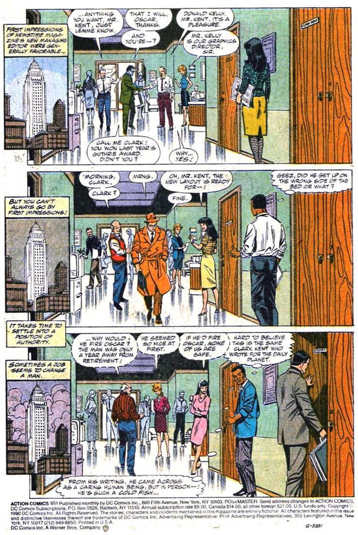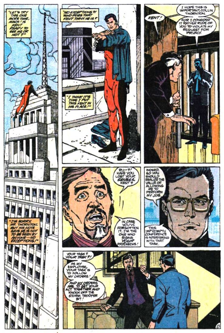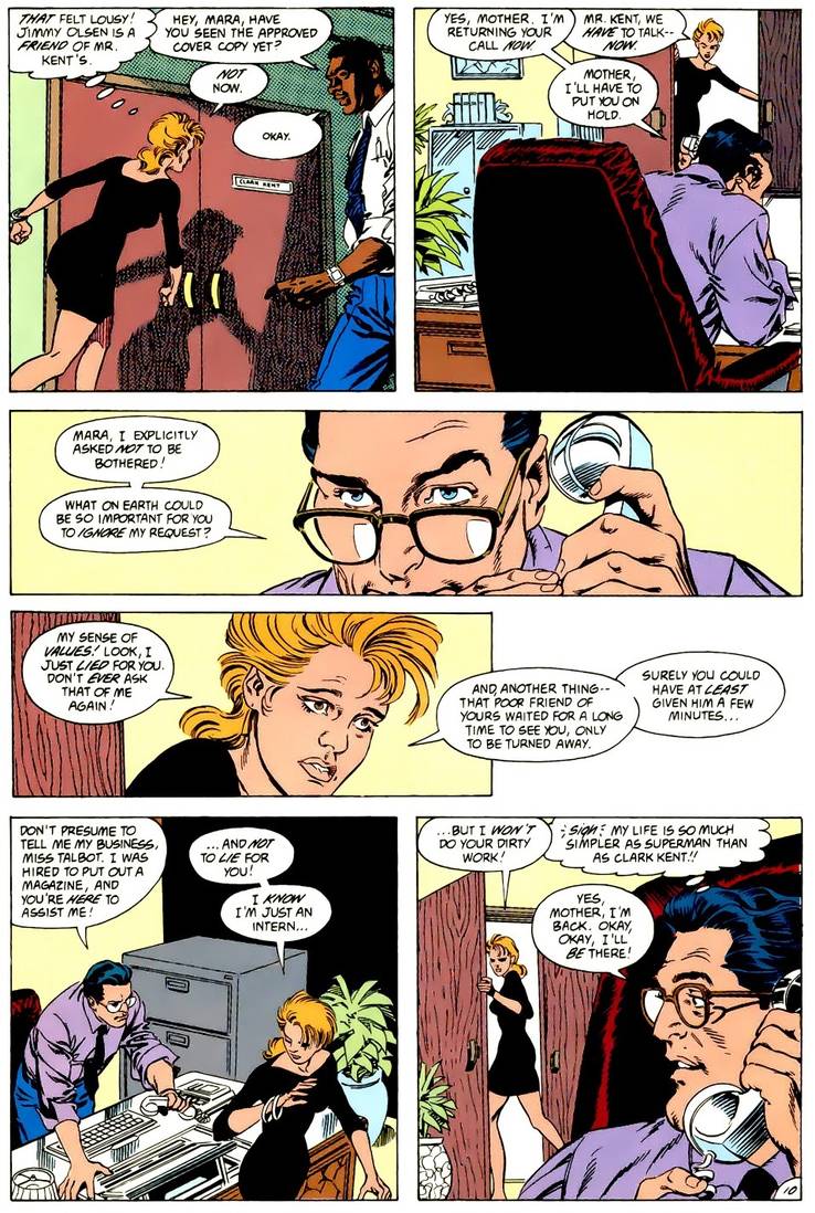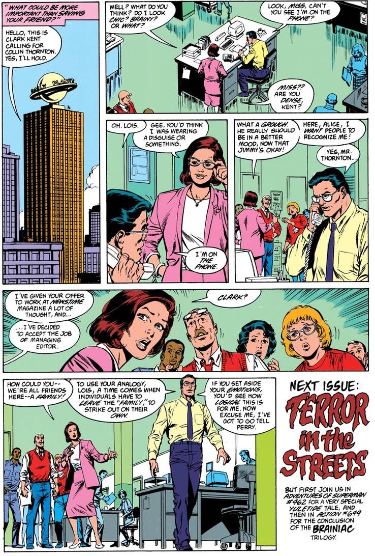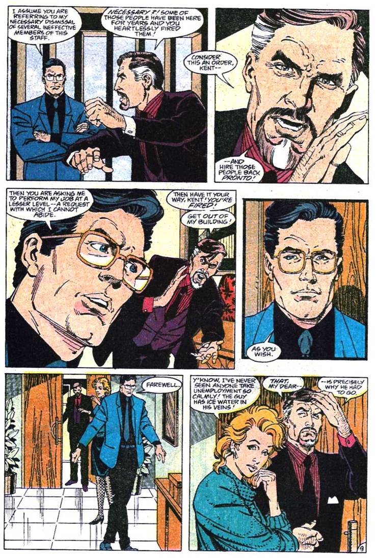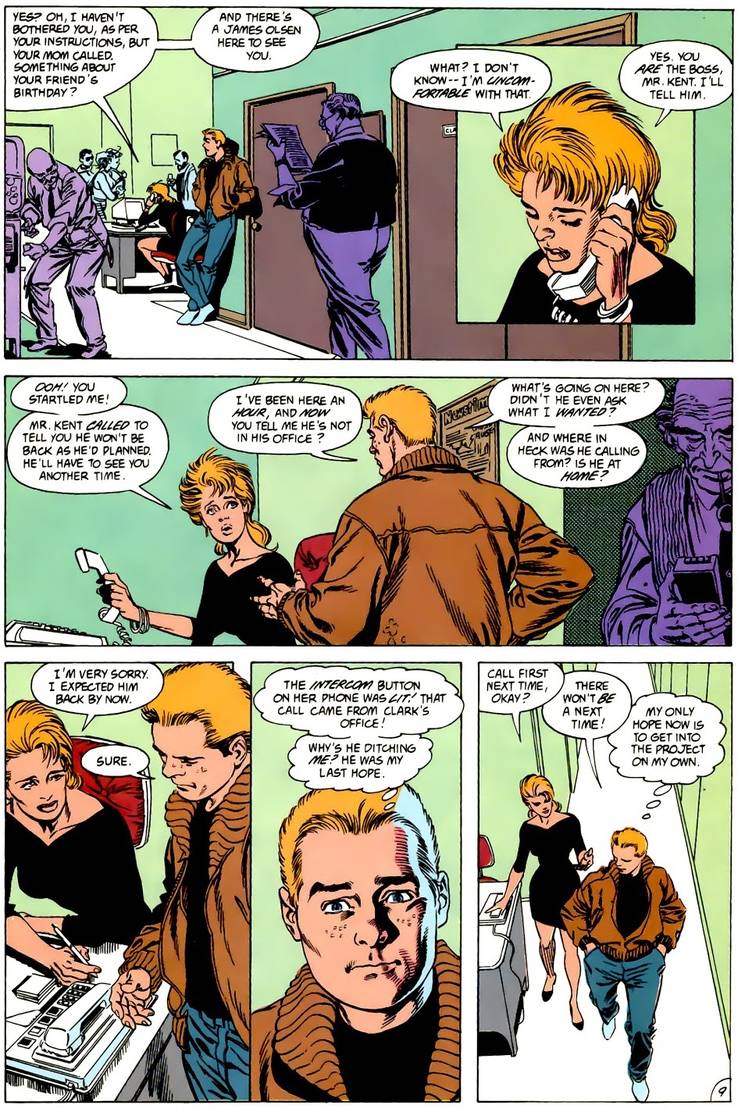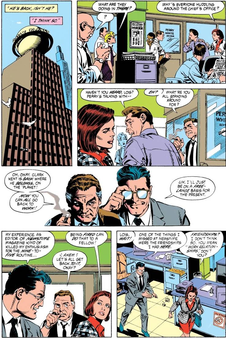 En Action Comics #651 (de Roger Stern, George Perez, Kerry Gammill y Brett Brett Breeding), vemos la evolución de su relación con el personal de Newstime desde que empezó a trabajar allí…