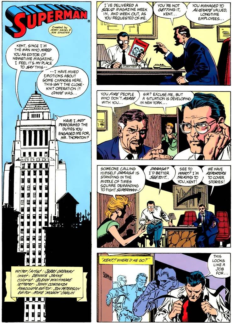 Todo comenzó en las Aventuras de Superman #460 (de Dan Jurgens y Andy Kubert), donde Collin Thornton, el dueño de la revista Newstime, se presentó en el Daily Planet para explicar que quería contratar a Clark Kent para ser el nuevo editor gerente de su revista.