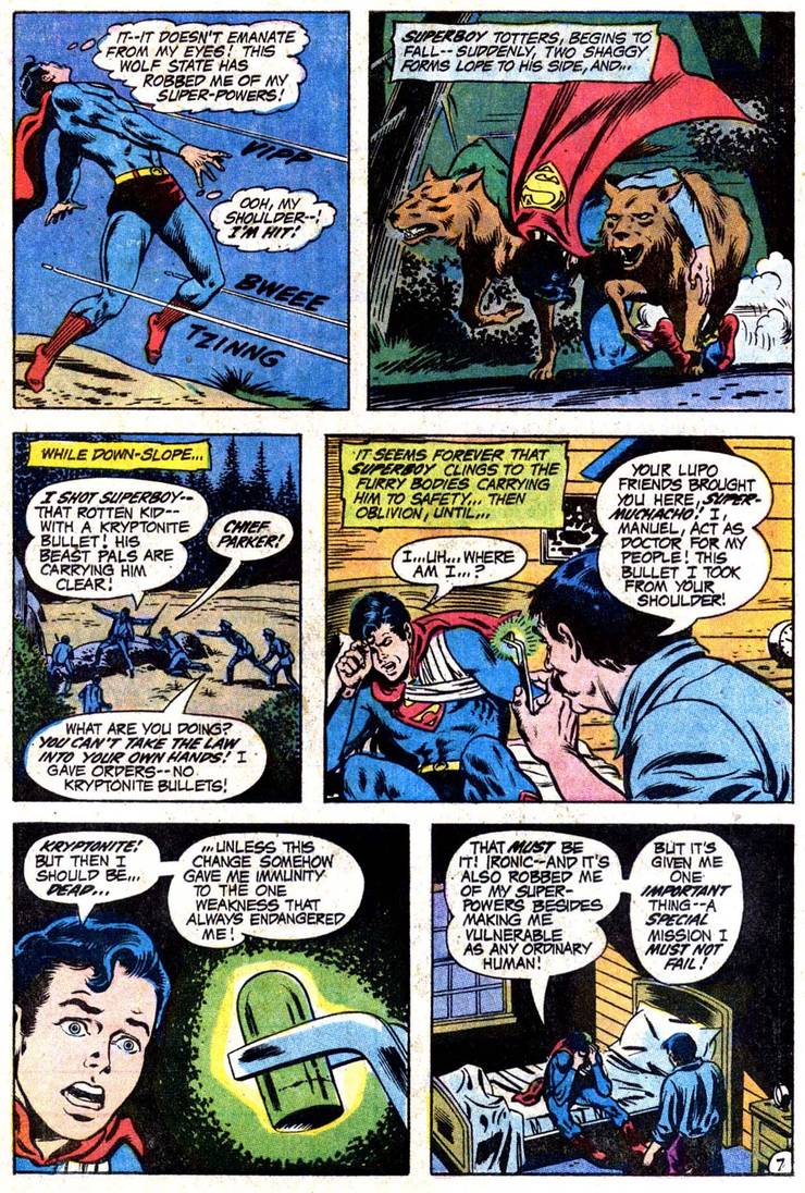 Bueno, en cuanto Weisinger dejó de editar los títulos, sus sucesores no se preocuparon especialmente por una cosa u otra y, como vimos en el Superboy #180 de 1971 (de Bob Haney, Bob Brown y Murphy Anderson), Superboy señala que tuvo suerte de perder temporalmente sus superpoderes (porque, en su lugar, ganó poderes tipo hombre lobo) justo antes de que una bala de kryptonita le alcanzara o, de lo contrario, habría estado jodido…