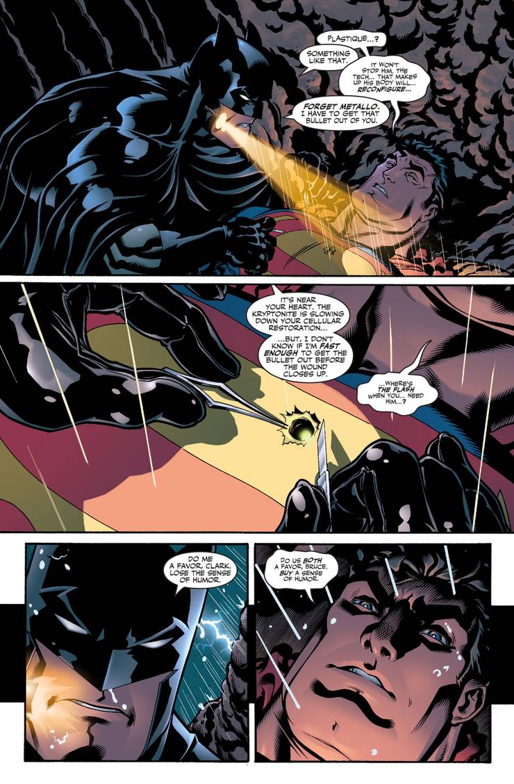 La bala atraviesa la piel de Superman y Batman tiene que moverse rápidamente para sacar la bala de Superman antes de que mate al Hombre de Acero…
