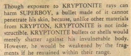 «Aunque la exposición a los rayos de KRYPTONITA puede dañar a SUPERBOY, una bala hecha de ella no puede penetrar en su piel, porque, a diferencia de otros materiales de KRYPTON, la KRYPTONITA no es indestructible. Las balas o proyectiles de KRYPTONITA simplemente se harían añicos contra su cuerpo invulnerable. Sin embargo, quedaría debilitado por los fragmentos si permaneciera dentro de su alcance».