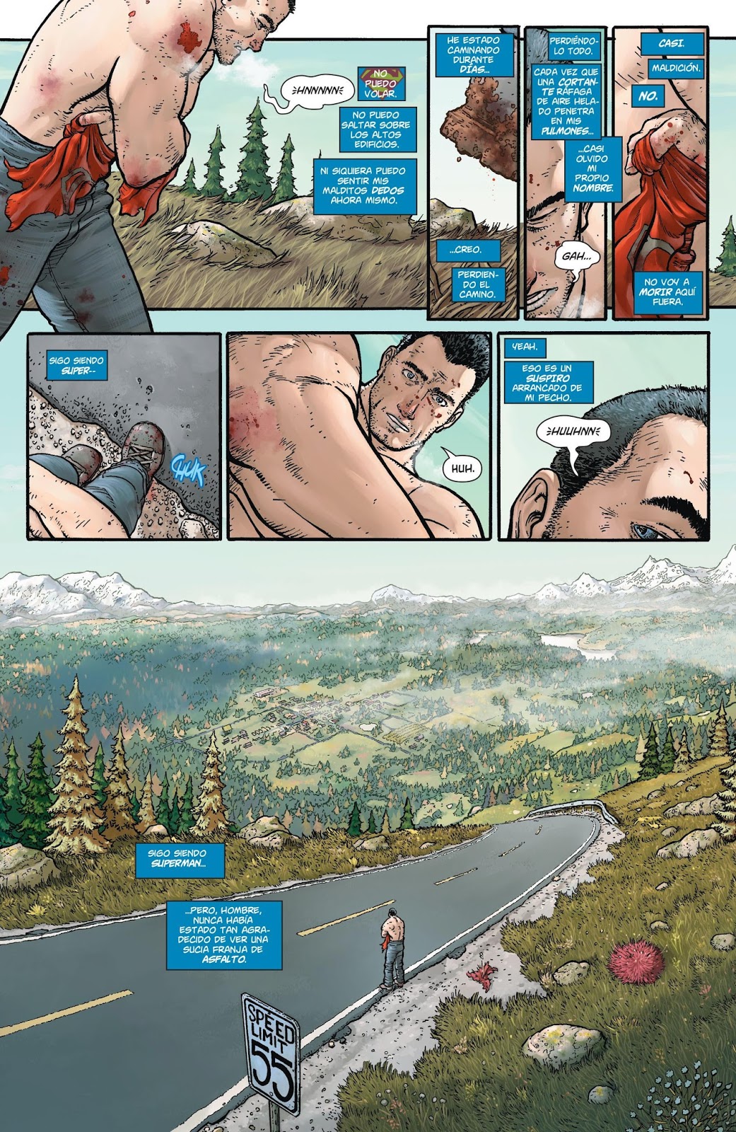 Comenzamos este nuevo número de Action Comics con Superman deambulando campo a través, magullado y semidesnudo, termina por salir a una carretera que le lleva a una pequeña localidad entre montañas, en donde entra en un establecimiento al lado de una gasolinera, comprando ropa para abrigarse. Ve varias camisetas, entre ellas una que lleva el emblema del Hombre de Acero, al tiempo que ve como los periódicos se han hecho eco de la revelación de su identidad secreta.