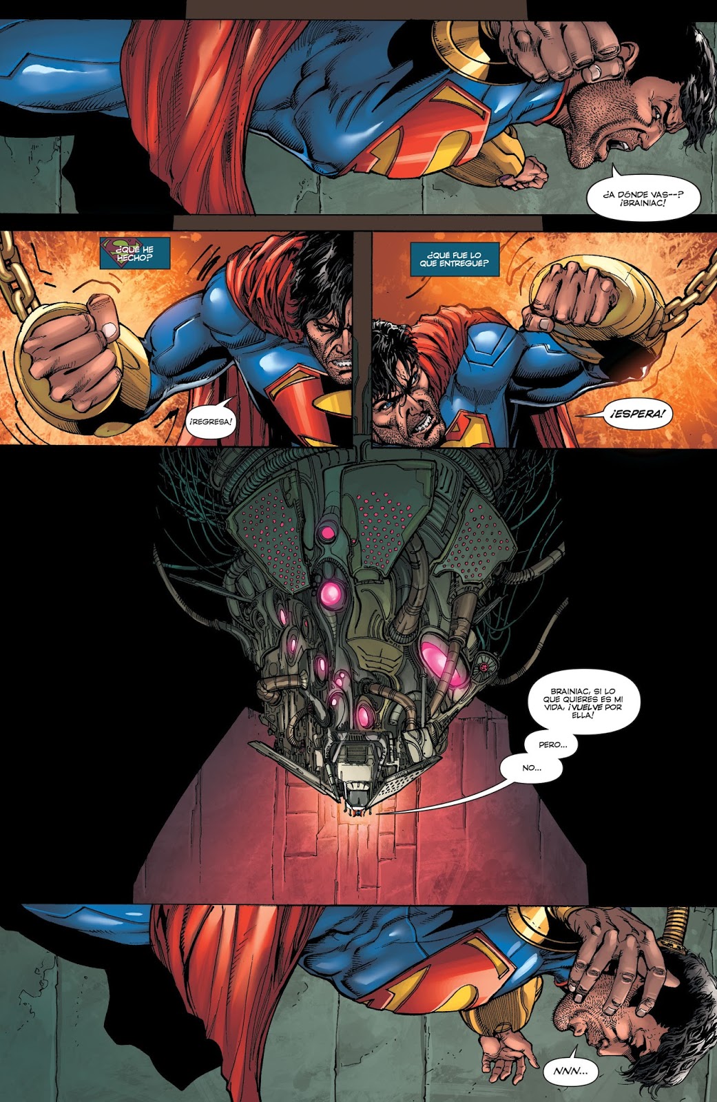 El Hombre de Acero comienza a golpear furioso a las distintas versiones de Brainiac, las cuales se regeneran décimas de segundos después de ser destruidas por Superman hasta que una de las versiones le hace caer en la cuenta de que el amo quiere traer una ciudad de la línea temporal del kryptoniano y a través de un remolino envía a Superman de vuelta pero haciendo que no recuerde nada de lo que ha visto hasta que llegue el momento oportuno de rememorarlo.