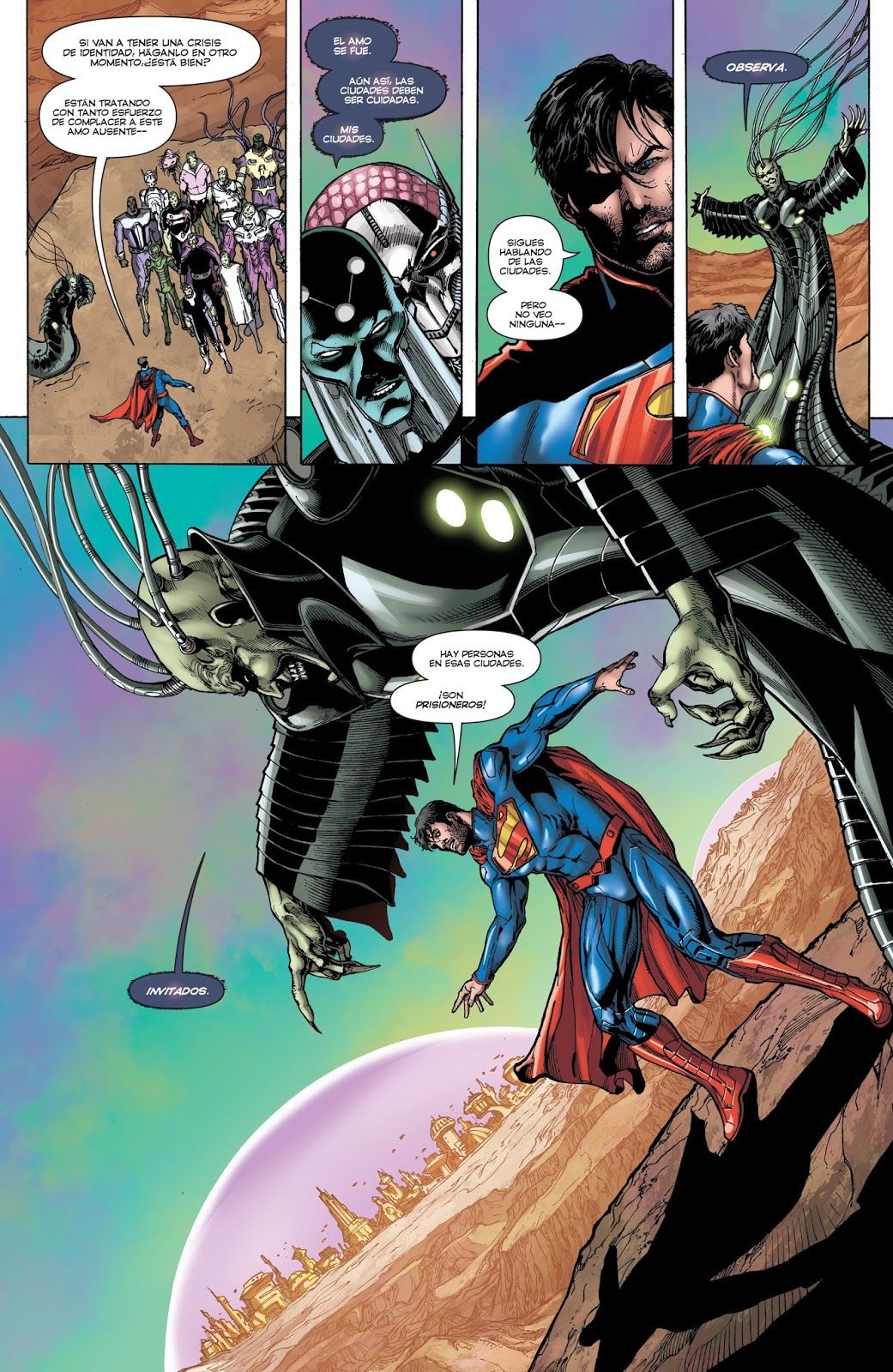 Este Brainiac dice que desconoce quién es pero si sabe que no es su amo ni niguna de sus variantes, al tiempo que de su cuerpo comienzan a salir todas la versiones conocidas del villano, que muestran las ciudades que tienen bajo custodia, Superman usa sus poderes de visión para contemplar enfurecido cómo todos sus habitantes permanecen en ellas intentando escapar desesperadamente.