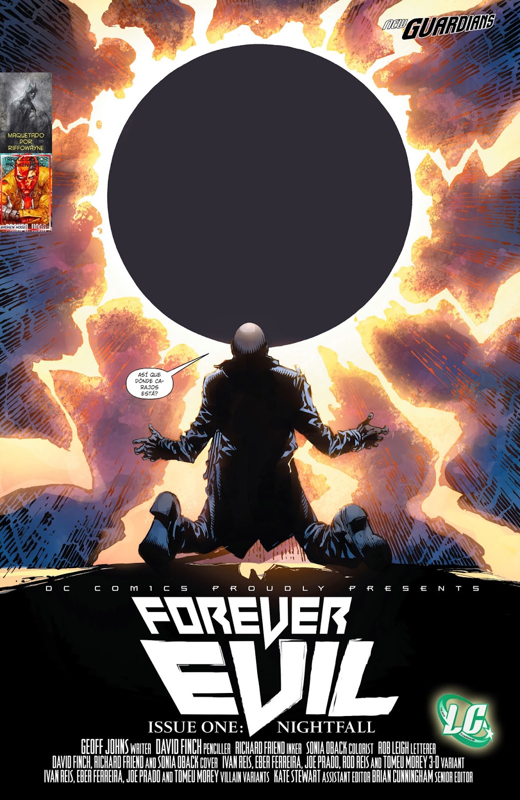 Forever Evil # 1 viene poco después de la conclusión de la Guerra de la Trinidad, pero no directamente después del cliffhanger de Justice League #23. En lugar de exhibir