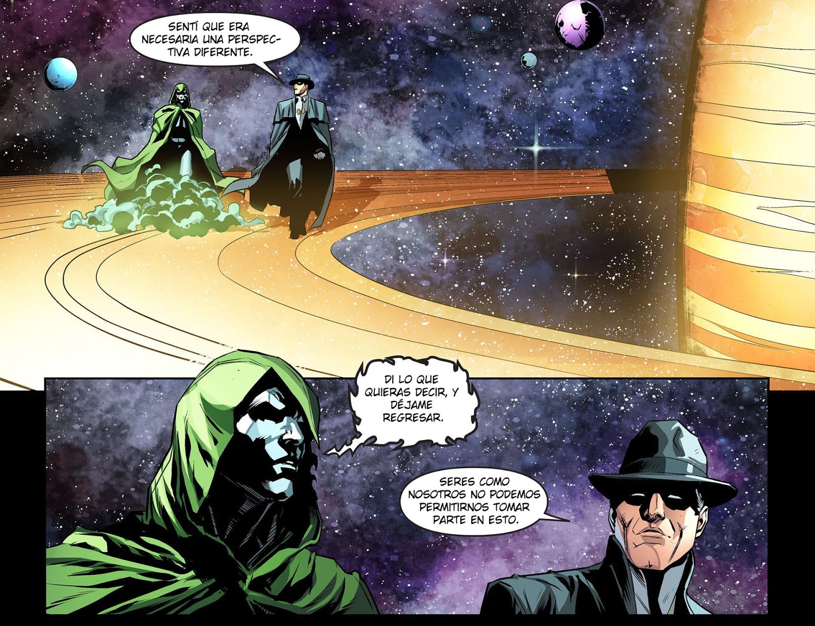 Mientras tanto, en la luna de Saturno, el Fantasma Errante no da crédito a quién se encuentra detrás del Espectro, y éste le dice que no es nadie para decirle qué debe o no hacer, ya que él también sabe quien es el Fantasma Errante y su historia,  el Espectro de pronto detecta que Superman está siendo atacado, pero el Errante se resiste a que escape, sujetándolo por su capa, pero el Espectro se revuelve, jactándose de que nada le puede detener y con su espada atraviesa al Fantasma Errante, que termina explosionando.