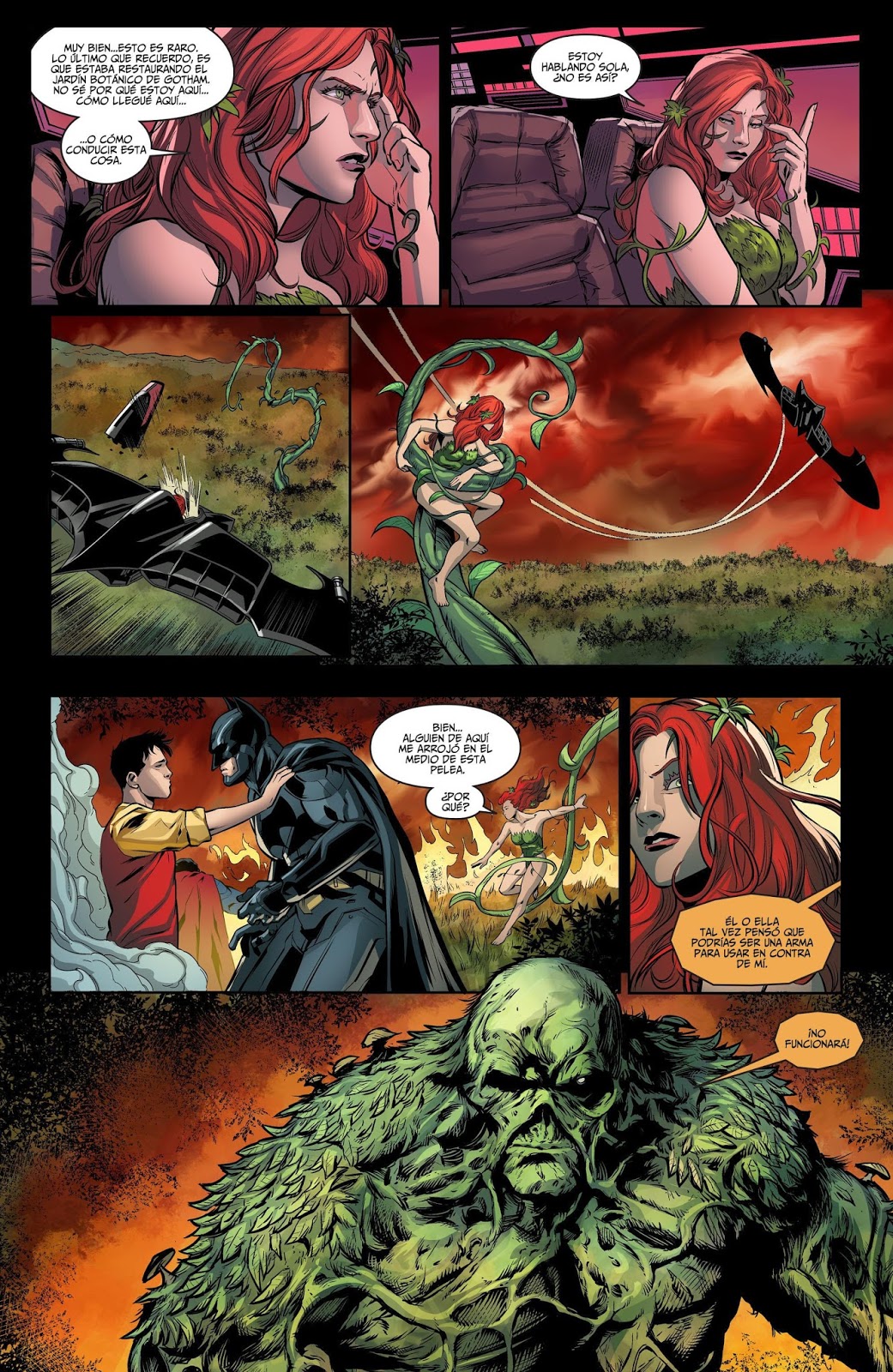 El Batwing vuela raudo hacia el campo de batalla pilotado por Hiedra Venenosa que ha sido controlada mentalmente gracias a los nuevos poderes de Dick Grayson. Éste termina controlando al Capitán Marvel y lo transforma en Billy Batson, de esta forma Hiedra Venenosa recupera la consciencia y salta de la aeronave siendo encontrada por la Cosa del Pantano que tiene la certeza de que planean utilizarla en contra de Superman y sus aliados.