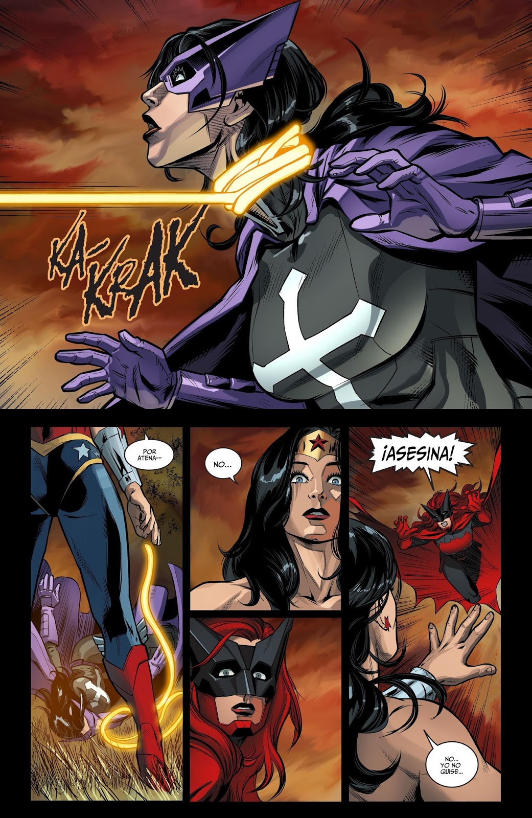 Batwoman y La Cazadora tratan de acabar con Superman viendo que se encuentra herido, pero Wonder Woman acude en ayuda del kryptoniano, y con su lazo terminana estrangulando a La Cazadora, lo que provoca la ira de Batwoman que trata de vengar a su amiga dando una descomunal paliza a la Amazona. Por su parte, Grayson, desde el cuerpo de Billy Batson le dice a Batman que no cometa el error de repudiar a Damian pues solo es un chiquillo y está equivocado.