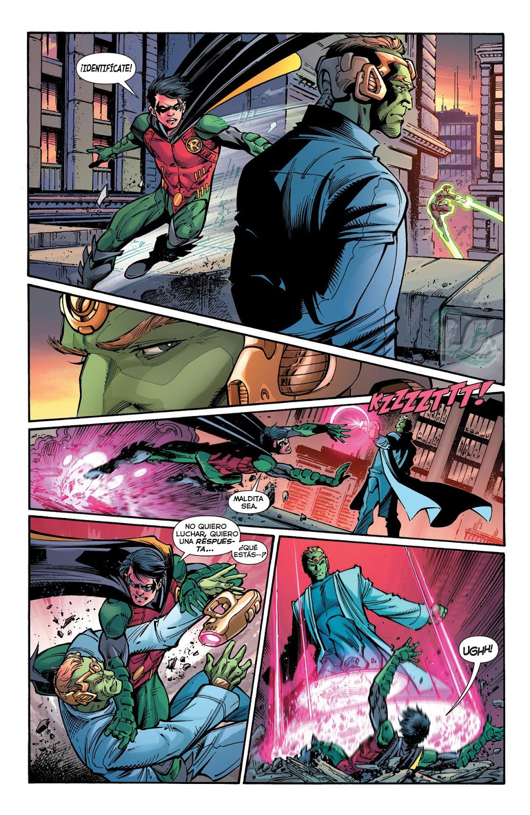 Pero las amenazas no terminan ahí, un misterioso hombre gigantesco entra en escena, atacando a los miembros de la Liga, Wonder Woman ordena a Robin que no intervenga y se ponga a resguardo, pero el Chico Maravilla, observa a como un misterioso hombre está observando desde la distancia el combate y se dirige a él. Robin queda asombrado al ver que el hombre tiene la piel de color verdosa y que comienza a atacarlo.