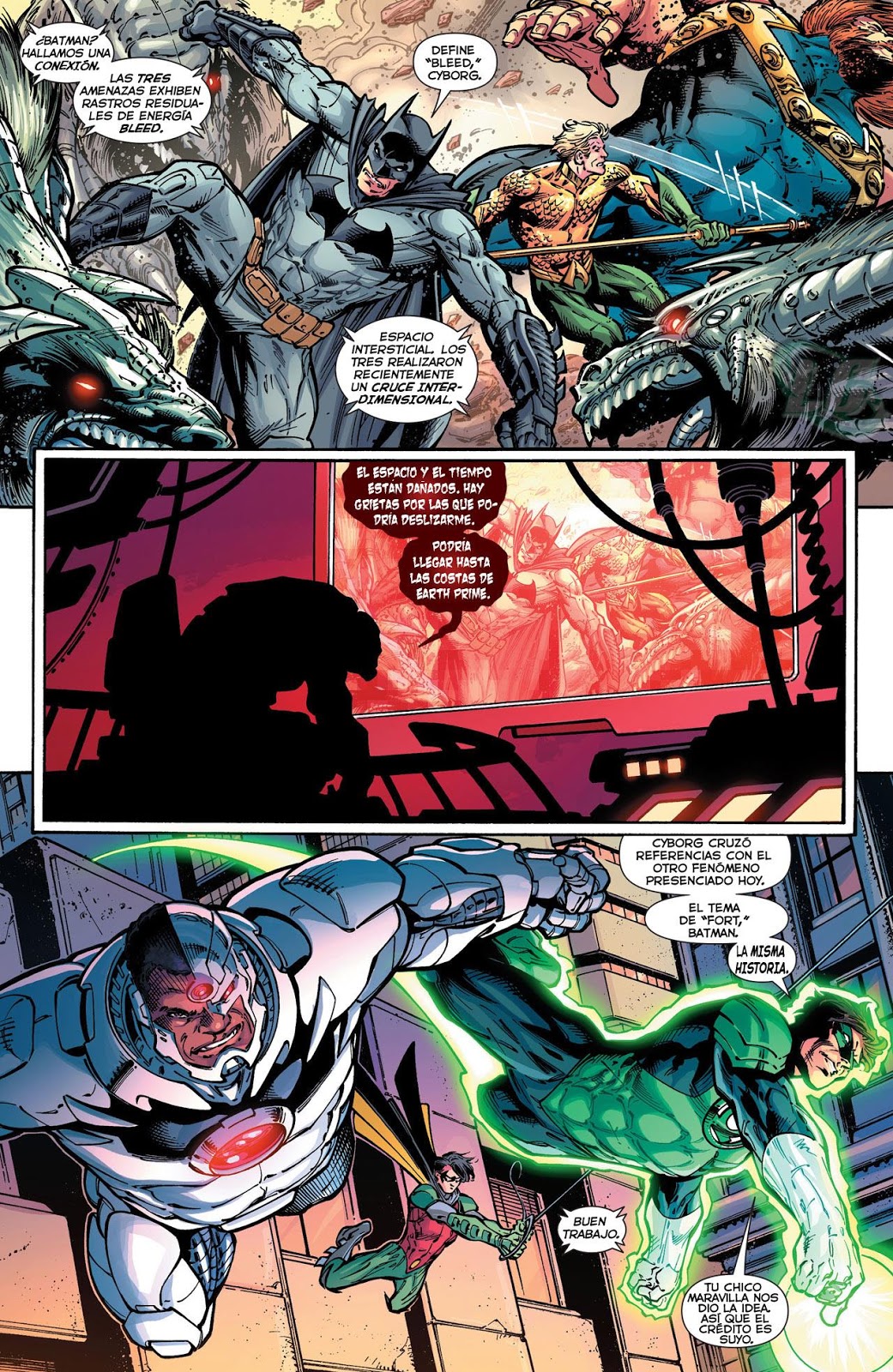 Wonder Woman acude al rescate de un magullado Robin, al igual que Ciborg e instantes después Green Lantern, que reconfortan al muchacho, el cual los deja impresionados al relacionar los tres ataques sufridos por la Liga de la Justicia. Ciborg tras escuchar a Robin procesa los datos y se da cuenta de que todos los atacantes muestran energía residual de cruces interdimensionales y se lo comunican a Batman. Lejos de allí, una extraña silueta observa desde una pantalla la batalla y comienza a planear que podría llegar hasta la Tierra sin mucha dificultad.
