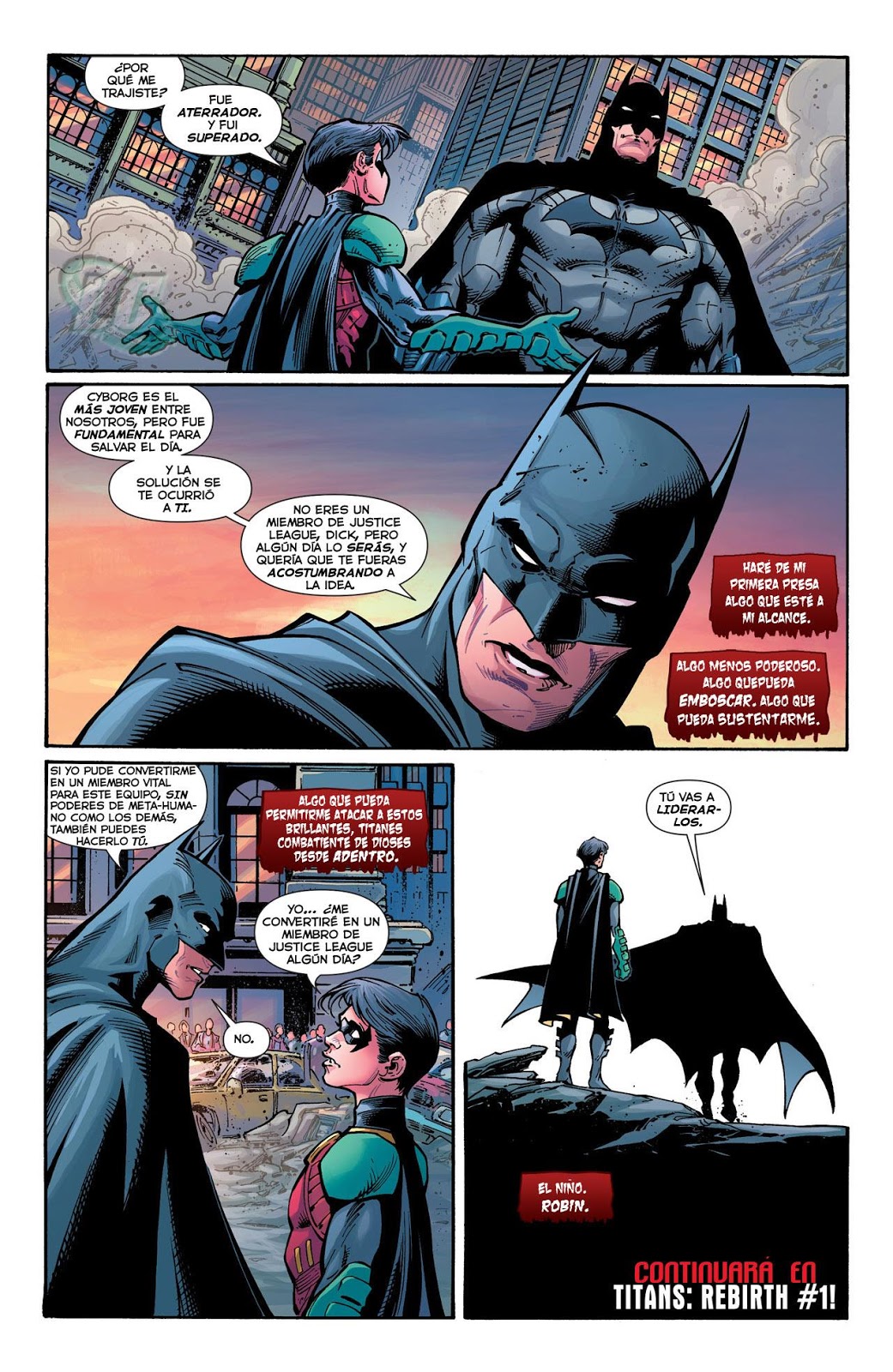 A partir de ahí, tenemos una historia ambientada en el pasado, tanto es así que el Superman caido se deja caer por las páginas del cómic, y que pondera las virtudes de Robin, lo que llena de orgullo a Batman. La trama es lo de menos, salvo por la enigmática silueta que observa los acontecimientos y que al final de la historia decide que se servirá de Robin cuando decida atacar la Tierra. Como decía al inicio, lo que haya de suceder, sudecerá en las páginas del primer numero de Titans: Rebirth.