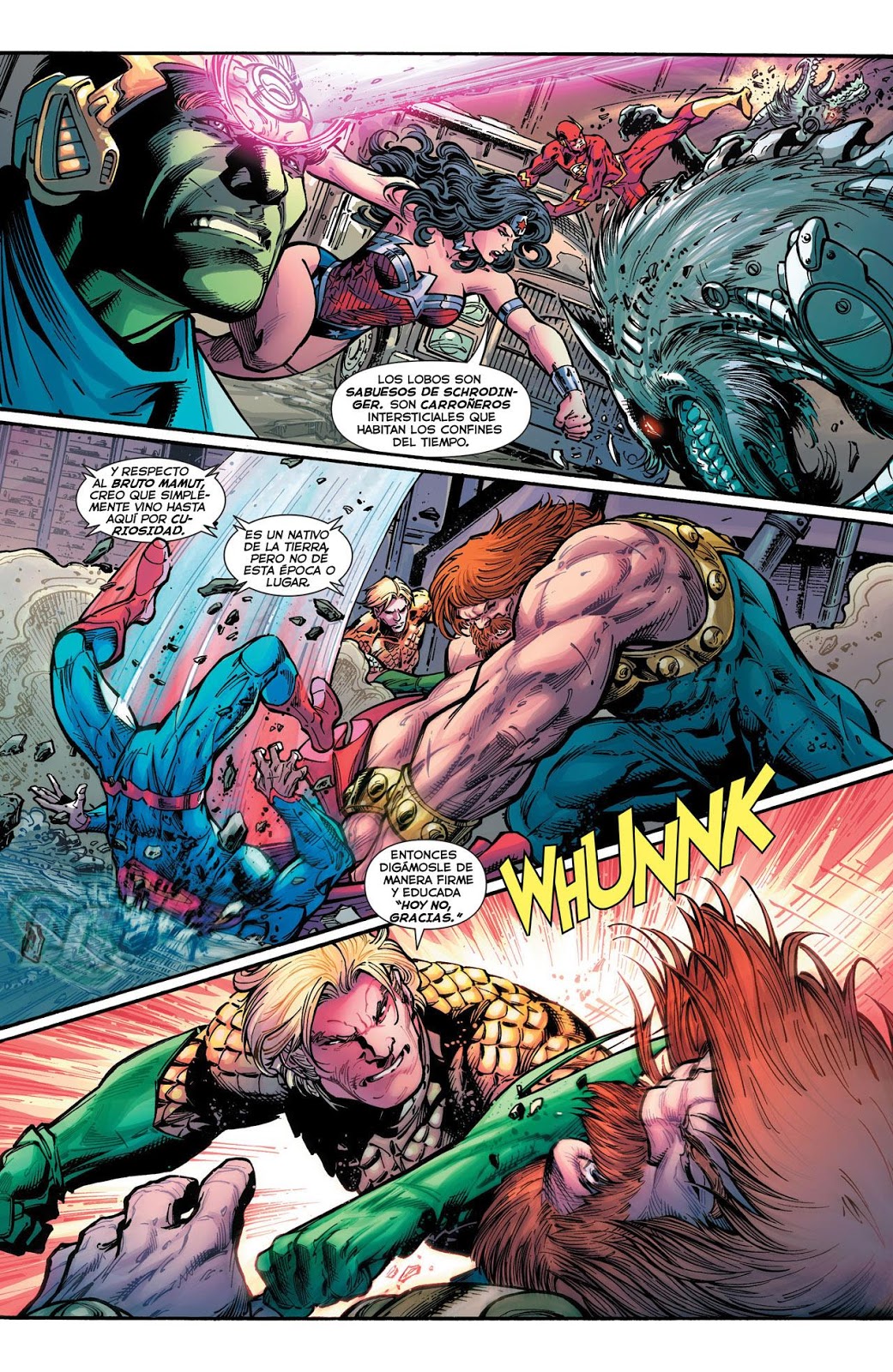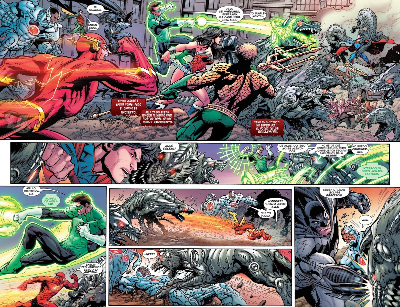 Ciborg continúa procesando datos y se da cuenta de que los atacantes están accediendo a la Tierra a través de una brecha que no se cerró cuando derrotaron a Darkseid años atrás. Por su parte el hombre verde logra comunicarse con Wonder Woman, afirmando ser Bron Wox, un científico del planeta Yod-Colu, y estar sumamente preocupado porque las brechas alcancen su planeta, por lo que ha viajado a nuestro mundo para encontrar una solución al problema. Wonder Woman informa a sus compañeros del cambihttps://www.blogger.com/blogger.g?blogID=7540136902171650526#editor/target=post;postID=8302629407812614789;onPublishedMenu=allposts;onClosedMenu=allposts;postNum=0;src=linko de situación sobre el tercer intruso, y Bron Wox les ayuda a combatir a los lobos robóticos y al gigante, que finalmente ha resultado ser un humano de otra época.