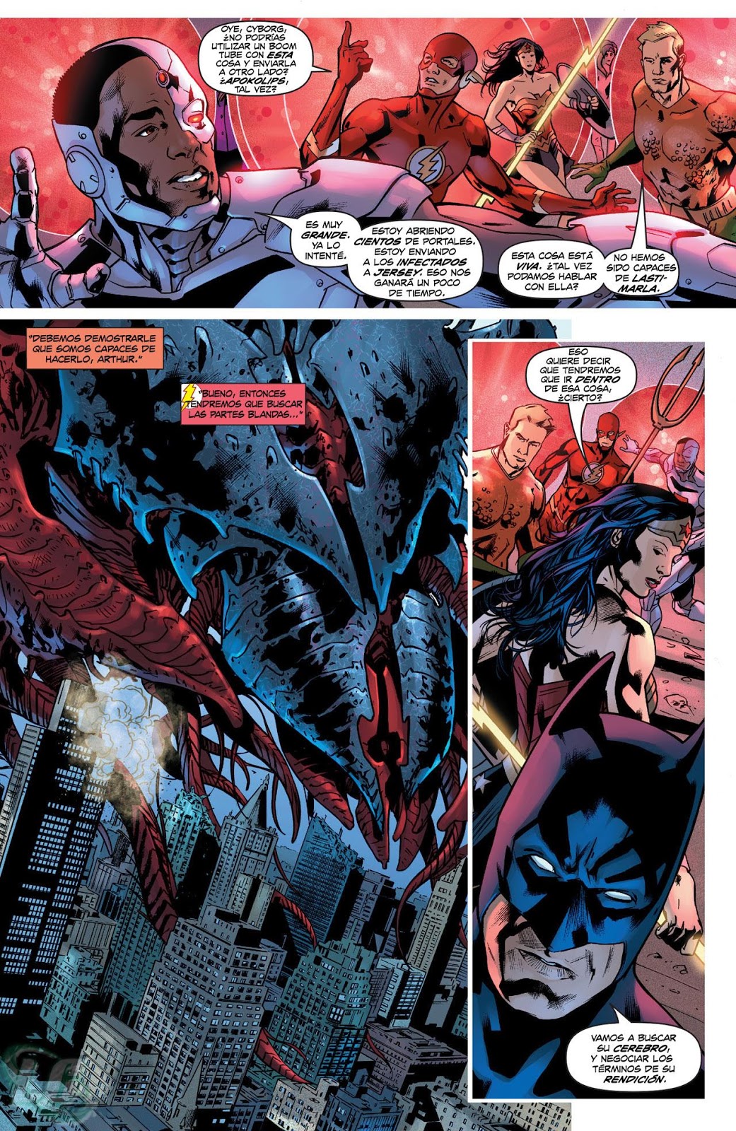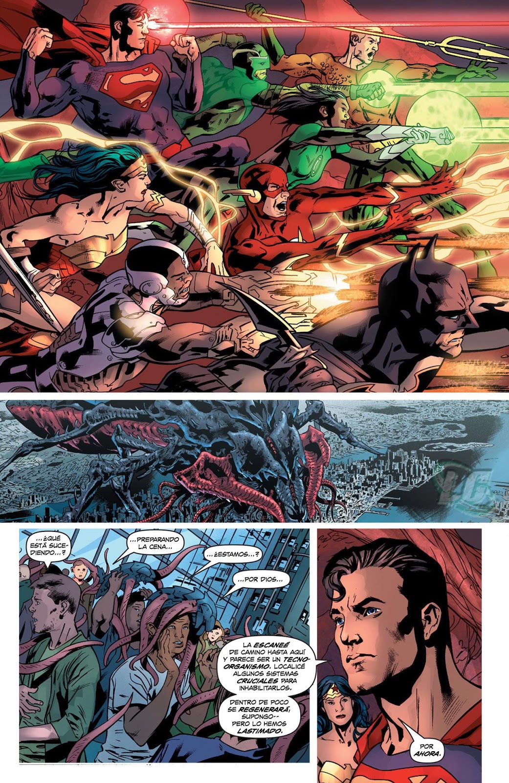 Número de presentación de la nueva etapa para la Liga de la Justicia. No es una historia excesivamente buena, el enésimo ataque a la Tierra por parte de un enorme monstruo llamado Cosechador es la excusa perfecta para ver como la Liga ha quedado coja tras la muerte del Superman New52 y se ve en serias dificultades para acabar con los peligros que se presentan día tras día.