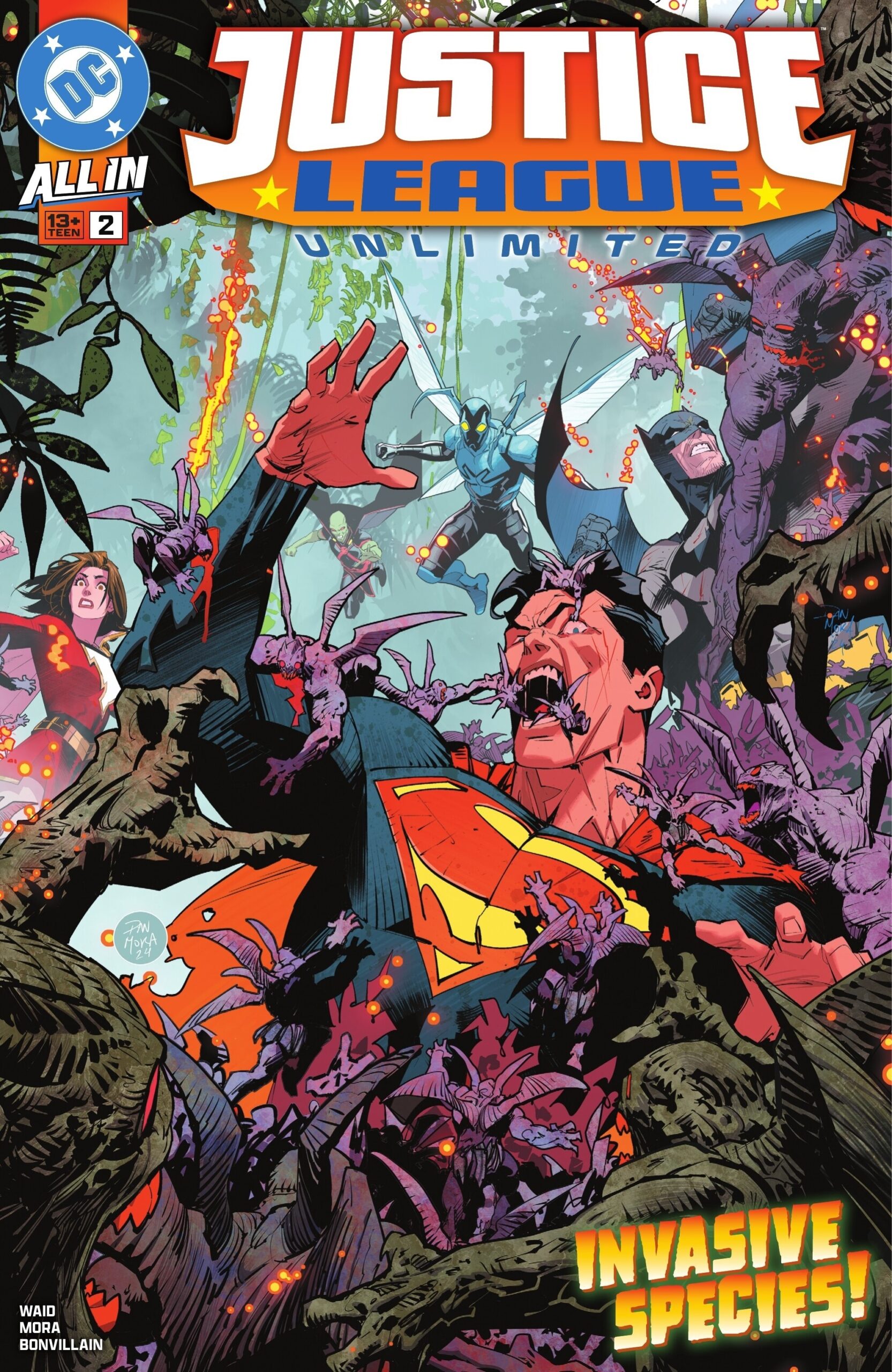 El equipo creativo vuelve a brillar: además de Waid y Mora, Tamra Bonvillain aporta un colorido espectacular y Ariana Maher se encarga de un lettering que añade ritmo y emoción. La combinación entre Mora y Bonvillain es, como siempre, sobresaliente. El arte de este número es deslumbrante, con un enfoque visual que mezcla acción y terror de manera magistral. Las secuencias ambientadas en la jungla tienen una atmósfera inquietante y vibrante, donde los tonos azules, verdes y morados de Bonvillain crean una sensación casi sobrenatural. Los diseños de Mora para los Parademonios son aterradores y, con los ojos rojos brillantes resaltados por el color, transmiten una amenaza tangible y espeluznante.