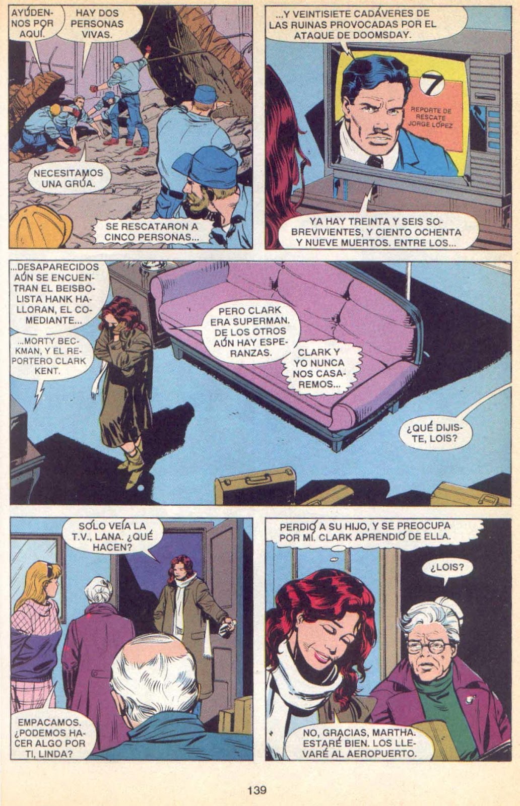 El resto del cómic es perseverar en la línea de lo que venimos reseñando, las reacciones de los secundarios e ir poniendo poco a poco los ladrillos que traerán de vuelta tanto a Superman como a Clark Kent. Me refiero al rescate de supervivientes de la batalla y al regreso de Pa Kent a Smallville, que como dije la semana pasada vivirá una aventura que facilitará el retorno de su hijo.