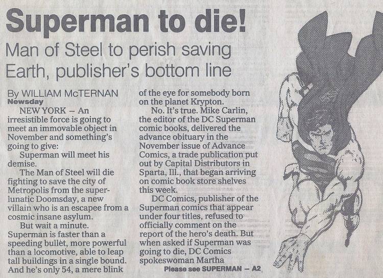 Pues bien, un periodista del New York Newsday, William McTernan, vio esta revista, vio «La muerte de Superman» en la portada y pensó que era una gran idea para una historia, así que el 4 de septiembre, el Newsday publicó un artículo sobre la entonces inminente muerte de Superman, y el frenesí mediático se desató a partir de ahí, convirtiendo esta historia en una de las más publicitadas de la historia del cómic (probablemente LA más publicitada, en realidad).