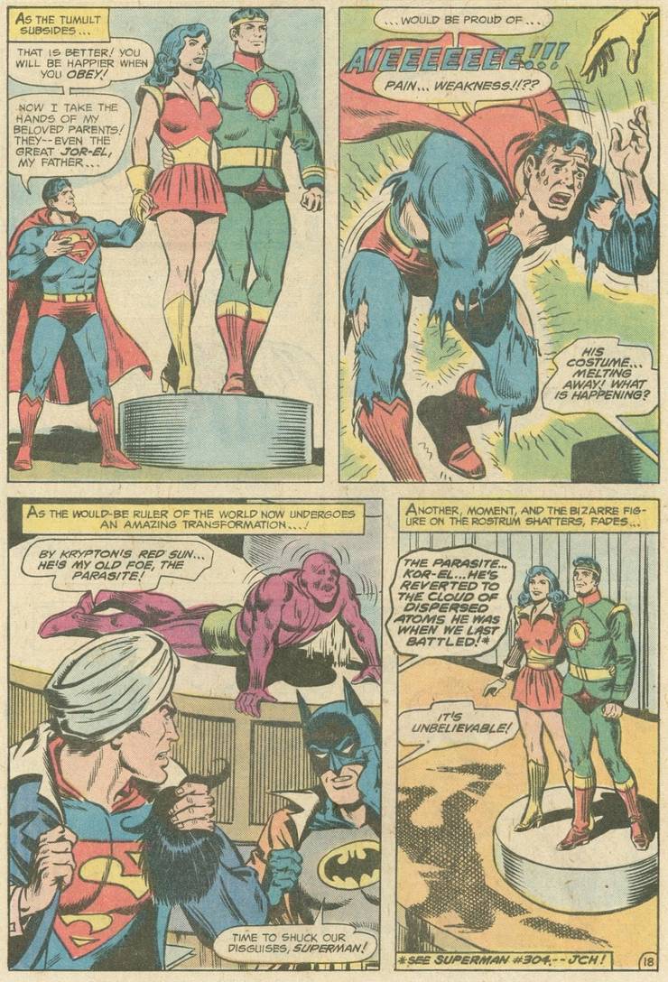 Hay TANTAS cosas locas en la historia, como que Superman fuera capturado y sentenciado a muerte (escapando sólo cuando Átomo tomó su lugar para que, cuando estuviera en peligro, «desapareciera») y finalmente, el gran giro… ¡Kor-El era realmente Parásito!