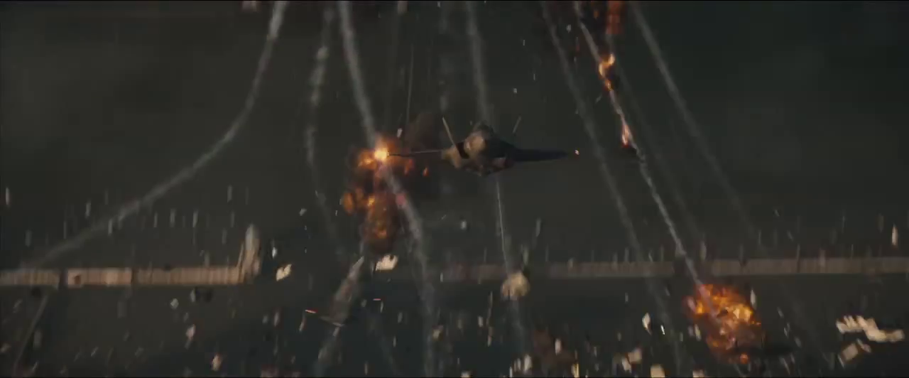 Un caza americano sobrevuela el cielo de Metrópolis en medio de una guerra campal kryptoniana